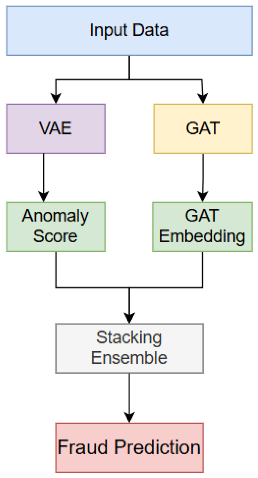 Despite these advancements, existing hybrid models often do not fully leverage the probabilistic modeling advantages of advanced autoencoder variants such as VAEs, nor do they extensively explore enriched graph representations capturing dynamic relational patterns. In response to these research gaps, our proposed approach integrates a Variational Autoencoder-based anomaly detection module with a GAT designed for relational modeling, employing an XGBoost meta-learner to unify and interpret the combined outputs. This framework aims to capitalize on the strengths of unsupervised probabilistic anomaly detection, attention-based relational learning, and ensemble fusion, thus offering improved accuracy and robustness to imbalanced and evolving fraud detection scenarios.