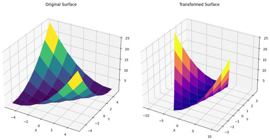 The proposed method based on partition is used to capture the consistency of geometrical characters considering the sample points of the actual surface and their transformations. Figure 1 depicts the actual, scaled, rotated and translated versions of the considered surface. In fact, we newly construct a matrix representation of size of 1024 equally spaced sample points on the surface (, , ). The computations are carried out using Python 3.11 programming. The above generated points are partitioned as discussed in Section 2. Therefore, the size of each partition of the considered grid is , where . A common principal direction is obtained for every partition of each L. Thus, the principal components of the abovementioned grids are computed. All the levels of wavelet transform are computed for the points obtained by PCA of each partition. The transformation of the sample points using in our study is carried out as detailed below. Scaling, rotation and translation are performed using scaling, rotation and translations in both the row and column as and . The partition and the principal components are computed for the transformed points as for actual points. Then, we calculate the proposed atypical detailed wavelet coefficients [2,3] of the principal components for the partitions on both sets of points. For this purpose, we use various orthogonal wavelets to perform an atypical wavelet transform. Despite the actual size of grid points, we provide only sample grid points for the sake of convenient presentation. Table 1 and Table 2 present the abovementioned sample grid of detailed wavelet coefficients of the points obtained by PCA of both the original and transformed images shown in Figure 2 by the Daubechies family of wavelets ().