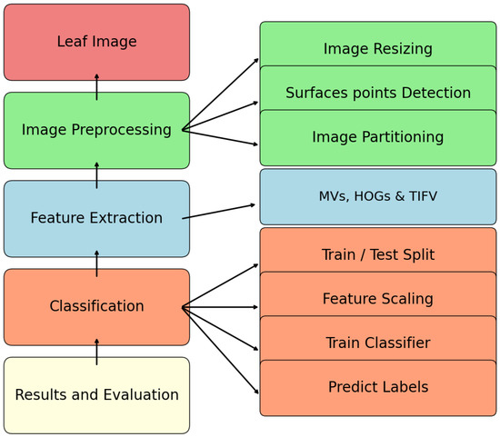 In this section, we study the influence of partition-based feature vectors in the classification of leaf shapes of the Flavia dataset (http://sourceforge.net/projects/flavia/files/Leaf%20Image%20Dataset/, accessed on 15 September 2025) [33,34] shown in Figure 3. A dataset of 25 images of each of the 32 types of the Flavia leaf dataset is investigated for the purpose of classification. We use machine learning techniques based on the RF method and SVM [35,36,37,38] for the study of classification. The proposed model consists of the five steps shown in Figure 4. The images of the leaves are resized so as to be uniform. The surface points of the resized leaf images are considered to proceed with the proposed algorithm. For this purpose, we generated sample points of three components from every leaf that are comparable with the points of the surface, described as follows. These points, in fact, are obtained as the location of the image in two dimensions and the intensity value of the image at that location as the third component. Suppose that the intensity value of the image at a location is denoted as ; then, the generated points will be of the form , that is, comparable with the points on the surface. The above such points are generated by grid sampling combined with point-in-contour filtering for the actual image and its transformations. We note, however, that the choice of intensity () as the third coordinate, while mathematically valid, does not represent a fundamental geometric property of the leaf and may be influenced by lighting or scanning; a binary mask representation would provide a purer geometric alternative. For our study, we normalize the size of each leaf image to 32 by 32 pixels. The feature parameter described in Section 2 of our study is extracted using Python programming for the abovementioned images. In the next step, the conventional Measured Values (MVs) [3,39] and Histogram of Oriented Gradient (HOG) [40], along with the proposed feature vector using leaf images, are computed. We used Google Colab for machine learning algorithms. It primarily offers CPU computing, GPU support and substantial memory. It also offers cloud-based storage for our datasets, code and experiment results, ensuring accessibility and reproducibility. Google Colab supports Python, making it compatible with popular machine learning libraries like Scikit-learn and Tensor Flow. In fact, the proposed work uses features of MVs and HOGs of the two dimensional images, along with the feature vector of the partitioned surface points of the leaf images. The MVs include the length of the contour line; area; major axis of the approximate ellipse, which is the length of the leaf; minor axis of the approximate ellipse, which is width of the leaf; and ratio of length over width [3,39]. HOG features are then computed using 9 orientation bins, pixels per cell and cells per block. In fact, the HOG descriptor is formed by computing gradient orientation histograms in small cells, grouping those into blocks for normalization and concatenating all block-level histograms to form a single feature vector [40]. Ellipse approximation of the leaf and normalized leaf, as well as HOG descriptor visualization, is shown in Figure 5. The proposed method of achieving consistency of the geometrical characters of the surfaces discussed in Section 2 is used in the classification study of the Flavia dataset. It is significant to note that the inclusion of the proposed feature vector, along with the rest of the features, enhances the classification efficiency.