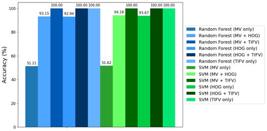 We use the sklearn module for the training of our SVM—specifically, the Support Vector Classifier (SVC) function. The SVC is employed as the base classifier within the binary relevance transformation. The linear kernel parameter associated with the SVC is used in our study [36]. Feature scaling is used in our study to help the SVM algorithm converge faster and ensure that the decision boundary is not biased towards features with larger numeric ranges. We also use the multi-label binarizer, which simplifies multi-label classification tasks by converting them into multiple binary classification subtasks, making it easier for SVM to learn and make predictions. In fact, we use tensor flow, which provides GPU acceleration for certain operations and significantly speeds up computations. To ensure the reproducibility of data splitting, the random state parameter is set to 42 when splitting the data into training and testing sets [36]. We then proceeded with the algorithm by considering MVs in one case, MVs and HOGs in a second case, MVs and TIFVs in a third case, HOGs only in the fourth case, HOGs and TIFVs in the fifth case and TIFVs only in the sixth case. In all the cases, labeled datasets were provided as input. In our study, we used a linear kernel for classification. In fact, 80% of 800 images are used as the training set and 20% are taken for the test set. The SVM algorithm finds an optimal hyperplane that separates the classes using the training set and classifies the data of the test set [36]. The results of the SVM algorithm show that the classification model including TIFVs performs much better, with 100% accuracy, compared to the model with only MVs, which achieves 51.62% accuracy, whereas the combination of MVs along with HOGs achieves 94.18% and HOGs only achieves 93.67% accuracy. Of course, studies are also carried out using the polynomial kernel and the RBF kernel, which results in the same classification accuracy level. This analysis is presented using a bar chart in Figure 6 for visualization, and the corresponding results are presented in Table 4. Thus, this classification study clearly shows that the inclusion of TIFVs, as proposed in Section 2, improves the classification performance.
