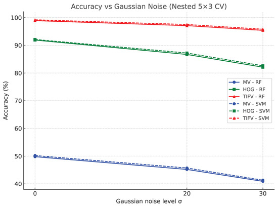 Figure 8 shows the accuracy vs. noise level for MVs, HOGs and TIFVs. TIFVs degrade gracefully as increases and outperform MVs and HOGs at all noise levels. Table 7 summarizes numerical results at representative noise levels. The relative accuracy drop of TIFVs from to is modest compared with HOGs and MVs. Using -regularized (and log) ratios further improves stability under higher noise levels. Similar trends are observed for macro F1 and macro recall. In the train–noisy/test–noisy (matched) setting, performance is uniformly higher than train–clean/test–noisy, indicating that the classifier can adapt to corrupted inputs. While Table 6 summarizes the baseline classification performance under clean conditions, it does not account for distortions that often arise in practical scenarios. To address this, Table 7 reports the nested CV performance when Gaussian noise of varying strength () is added to the intensity channel. The results highlight that although MVs degrade rapidly with noise, HOGs remain moderately stable and TIFVs exhibit strong robustness, retaining high accuracy and balanced macro F1/recall even at . This confirms that TIFVs not only achieve the best clean-image performance but also maintain reliability under noisy conditions. We restrict Table 7 to individual feature families; the combined variants follow the same robustness trends and are omitted for brevity. Note that Table 7 reports results for the train–clean/test–noisy setting only, whereas Figure 8 illustrates both train–clean/test–noisy and train–noisy/test–noisy (matched) scenarios to highlight the impact of training on noisy data.