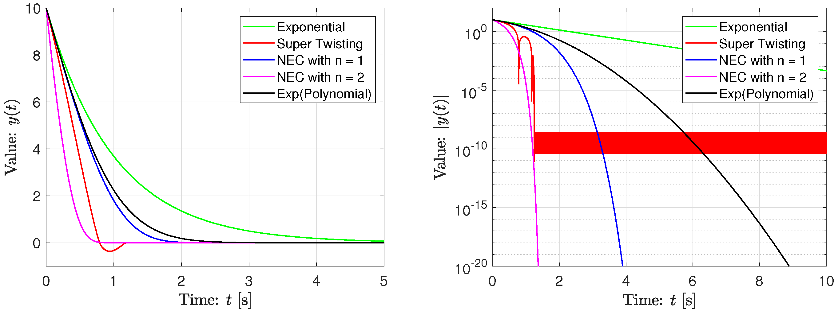 in the ST algorithm converges to zero after a finite time, resulting in an almost vertical line. However, from a practical point of view, the ST algorithm relies on an infinite “linear” gain value at