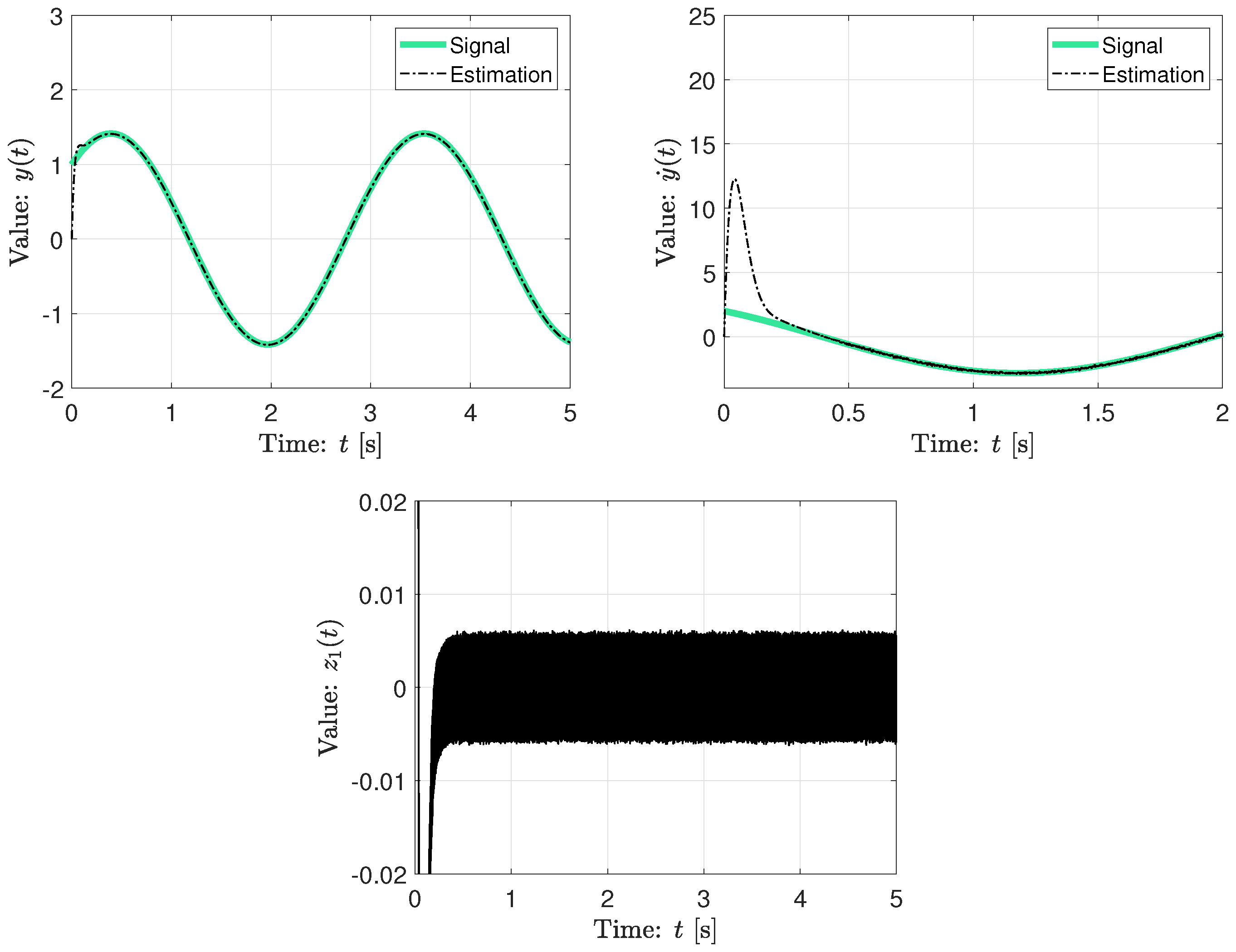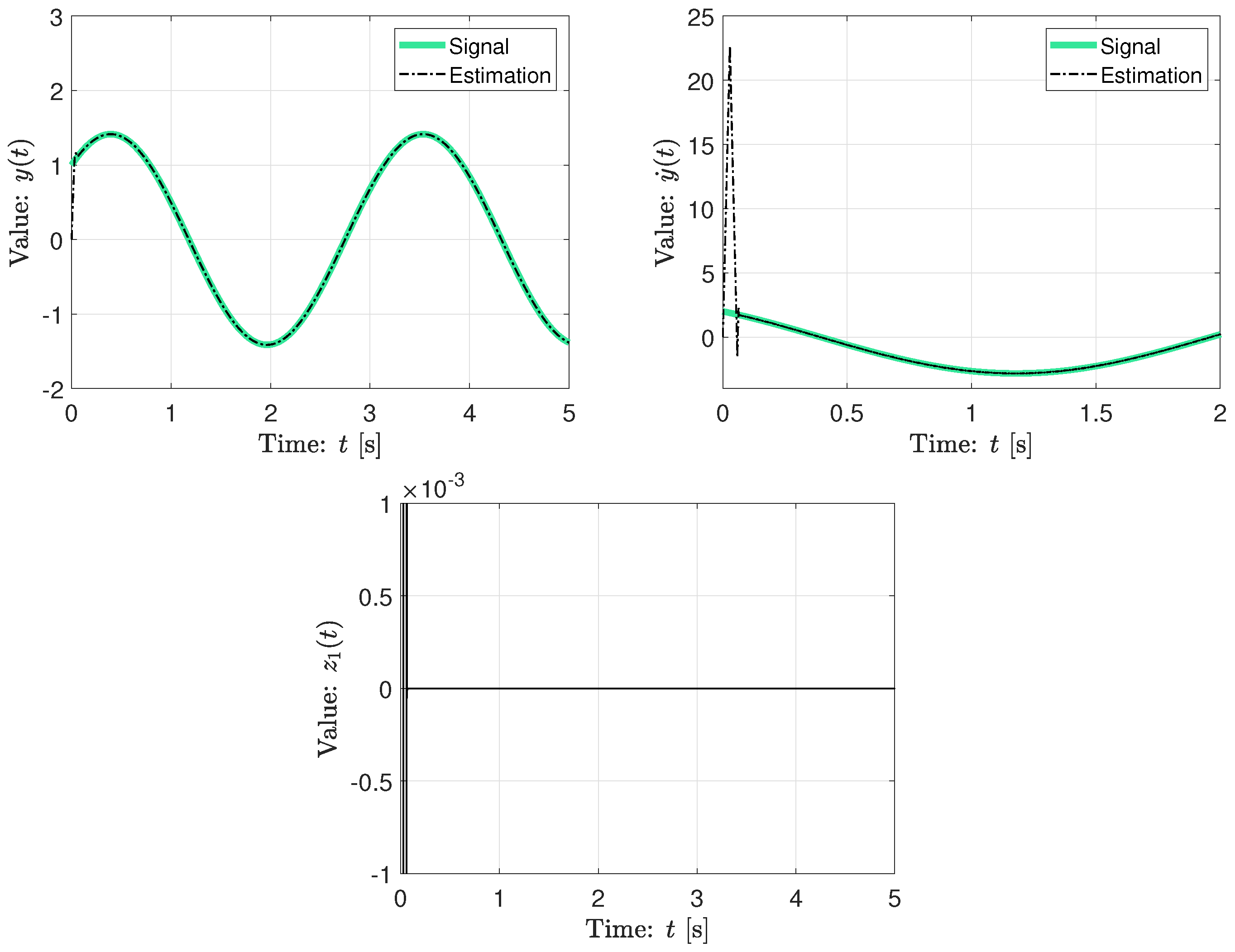 Figure 2 presents the results for the noise-free case, where both the estimated signal and its derivative converge to their ideal values, and the estimation error converges to zero. The proposed design produces an Integral Squared Error (ISE)
