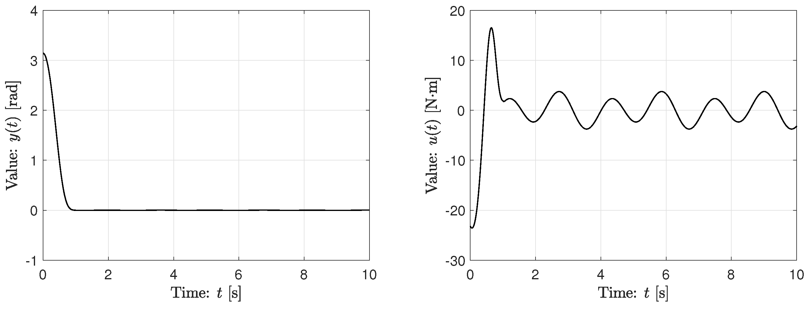 Figure 7 shows the results of the numerical implementation of a conventional Proportional-Integral controller with feedforward compensation. The output signal exhibits a behavior similar to that of the proposed NEC controller; however, the control signal exhibits high-amplitude transient dynamics, with also a large overshoot, which could be detrimental to the process.