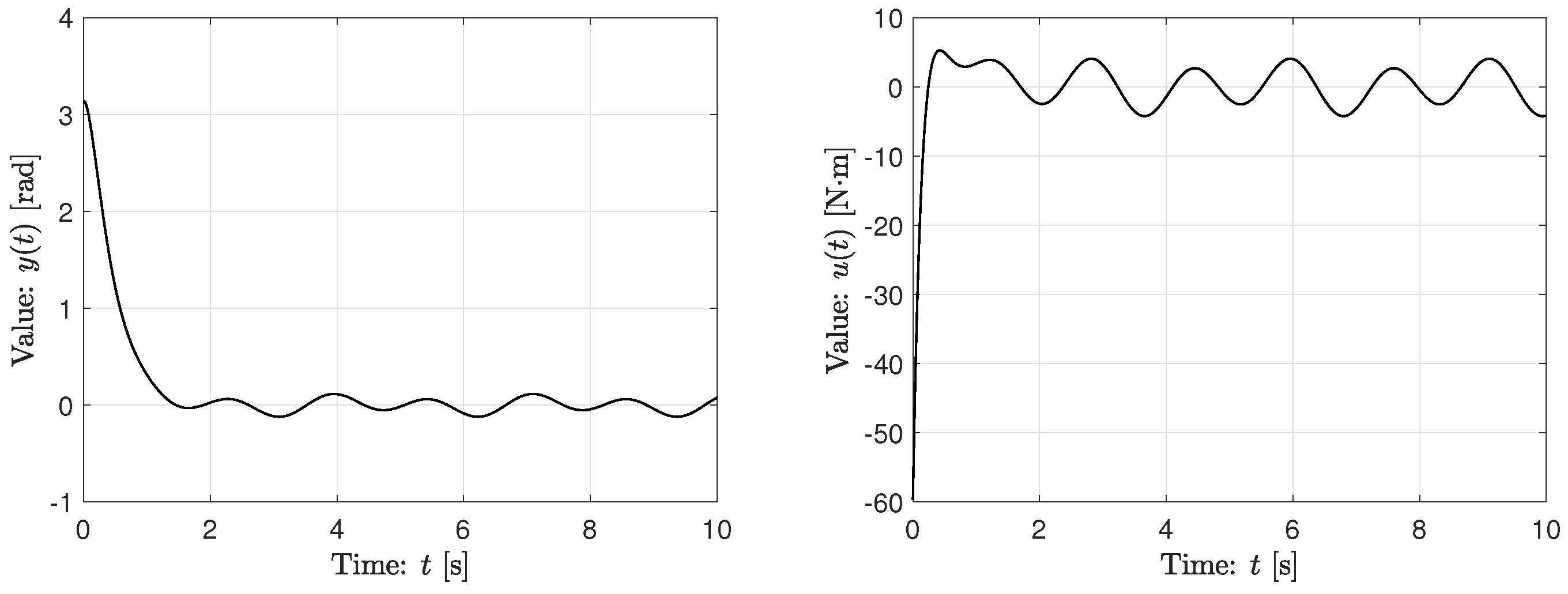 Figure 6 presents simulation results. The output evolves close to zero despite disturbance, and the control signal remains within acceptable limits.