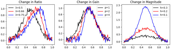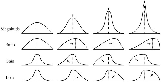 - Gain—The Gain (or Loss) of any peak graph, of Magnitude equal to 1, can be easily controlled by raising its Gain (or Loss) part to the power of . We can achieve such a peak graph by taking from Equation (4) and normalizing it by dividing it by the value of Magnitude. Hence, we define it byFor Gain, we chose the values of p to be , and measured the ratio: