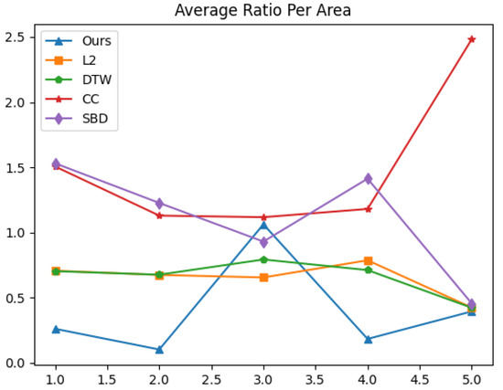 Average ratio of close sampled peaks’ distance to distant (cross area) peaks’ distance per area, for each distance function.
