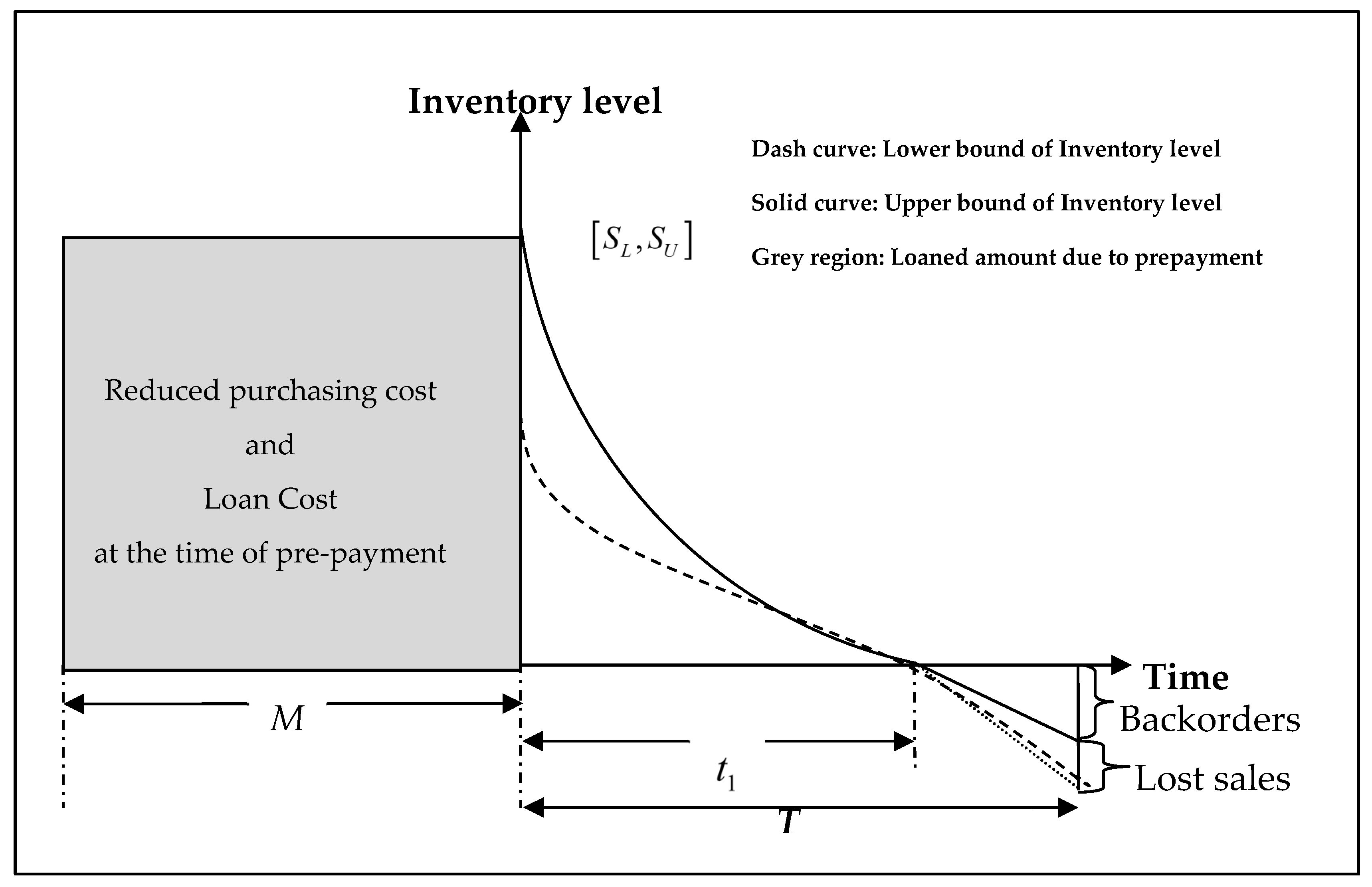 Hence, the total purchasing cost is C i L , C i U S L , S U + R L , R U . Since the buyer prepays the full purchasing cost at time M before receiving the goods, they receive a certain percentage discount on the total purchasing cost at the time of prepayment. Consequently, the reduced purchasing cost and the associated loan cost are determined as follows