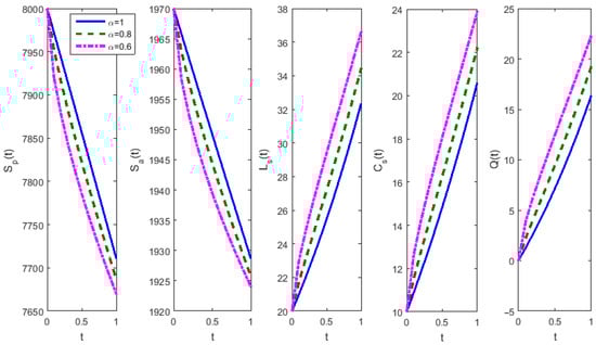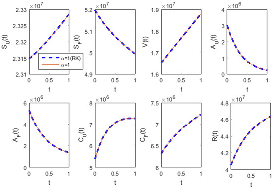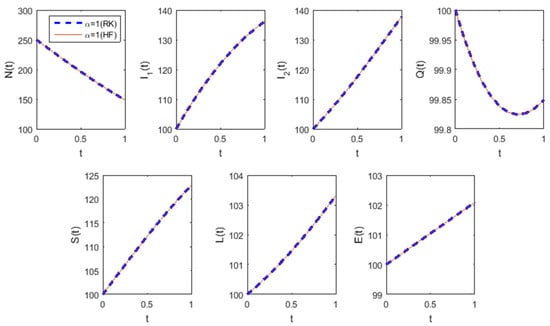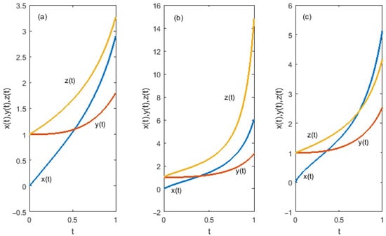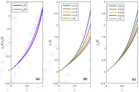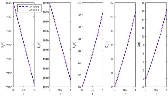 The piecewise linear HF solutions (Figure 1a) obtained by our numerical method using the step size of 0.001 for and are in good accordance with the solutions acquired via the fractional differential transform method in [36] (see Example 2 in [36]) and by the Legendre wavelet-based numerical method in [37] (see Example 5.2 in [37]). For different and , our numerical method (with ) produced the same results (Figure 1b,c) as the Legendre wavelet-based numerical method provided in [37] (see Example 5.2 in [37]).