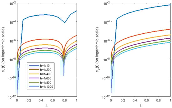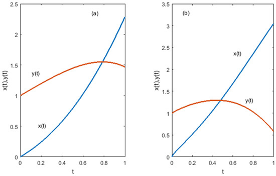 In this section, the numerical method devised in Section 4 is applied to the systems of linear and nonlinear fractional-order differential equations. All numerical experiments presented in this study were performed using MATLAB (version R2021b and later) on a personal computer equipped with a 13th-generation Intel® Core™ i7-1355U processor and 1.70 GHz RAM. The proposed numerical algorithm was implemented through original source code written by the authors. The resulting system of algebraic equations, obtained via the hybrid function-based formulation, was solved using MATLAB’s built-in fsolve function. The default trust-region dogleg algorithm was used. The only adjustable parameter in the method is the step size h, which determines the time discretization level and resolution of the hybrid basis functions. The value of h was selected based on the complexity of the test problems. For simpler systems, a moderate step size (e.g., h = 1/10) was sufficient to achieve high accuracy, whereas more complex problems involving nonlinearities or variable coefficients required smaller step sizes (e.g., h = 1/300 to h = 1/500) to maintain solution fidelity and numerical stability.