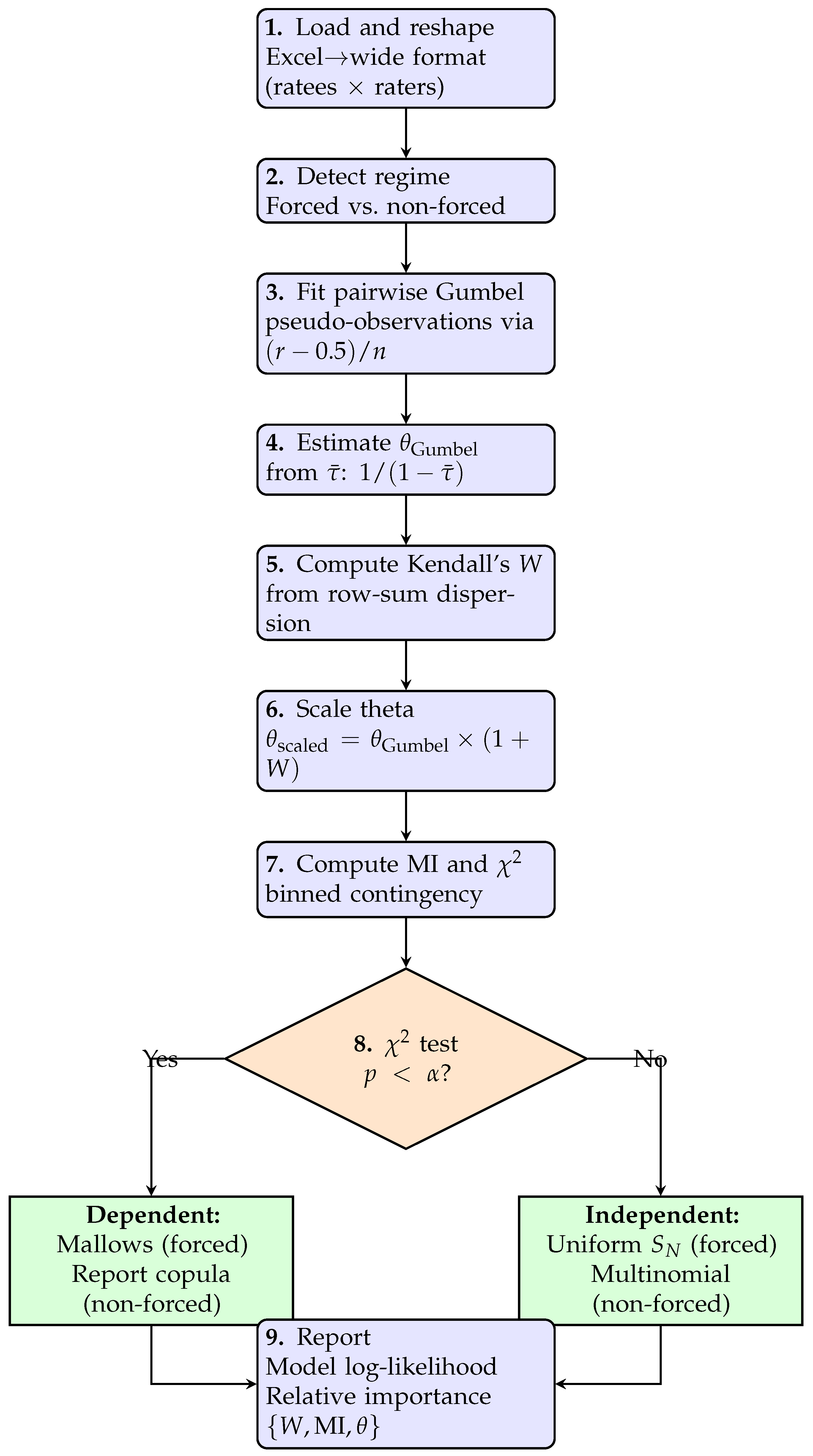 - Key libraries. Core dependencies are numpy, pandas, and scipy (Kendall’s , , entropy/MI), plus copulas for Gumbel fits; openpyxl/xlsxwriter are used for Excel I/O; matplotlib supports visualization. Full, pinned versions are listed in requirements.txt at the repository root.