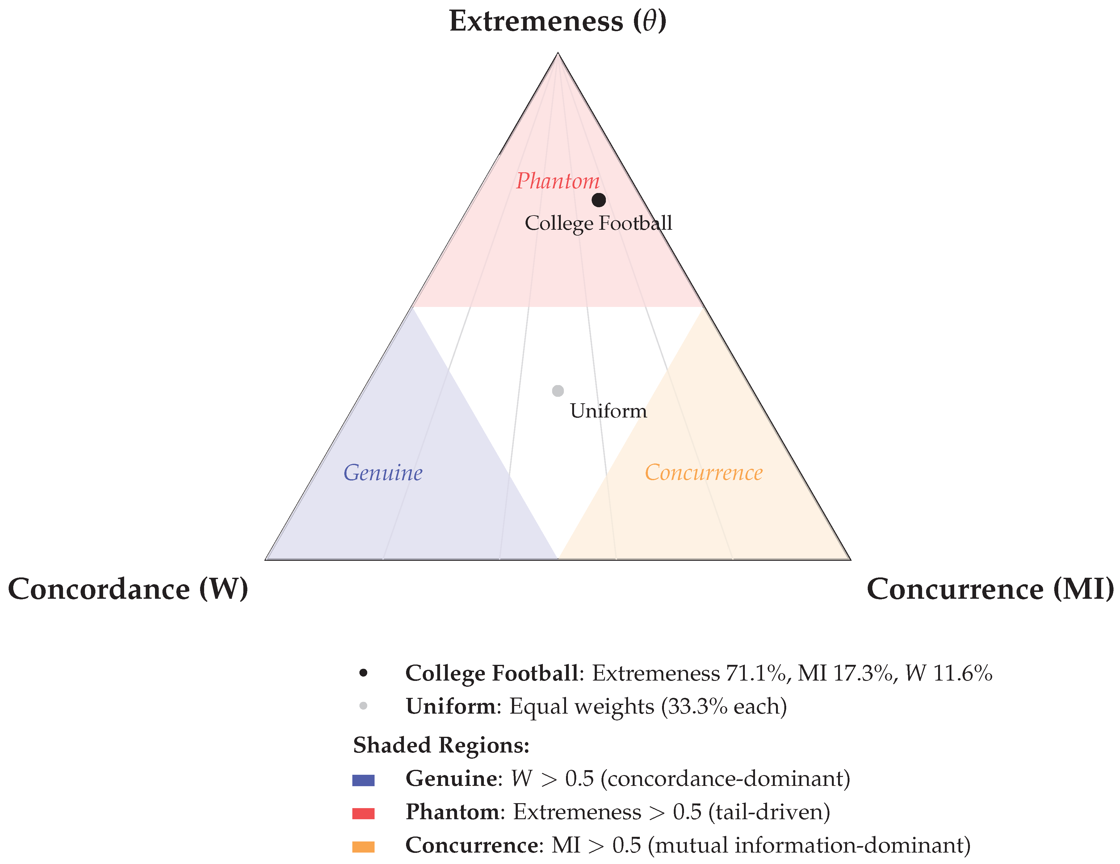 - Relative importance decomposition. Report normalized weights over {Concordance W, Concurrence (MI), Extremeness }; these are interpretable as contribution weights, not probabilities.