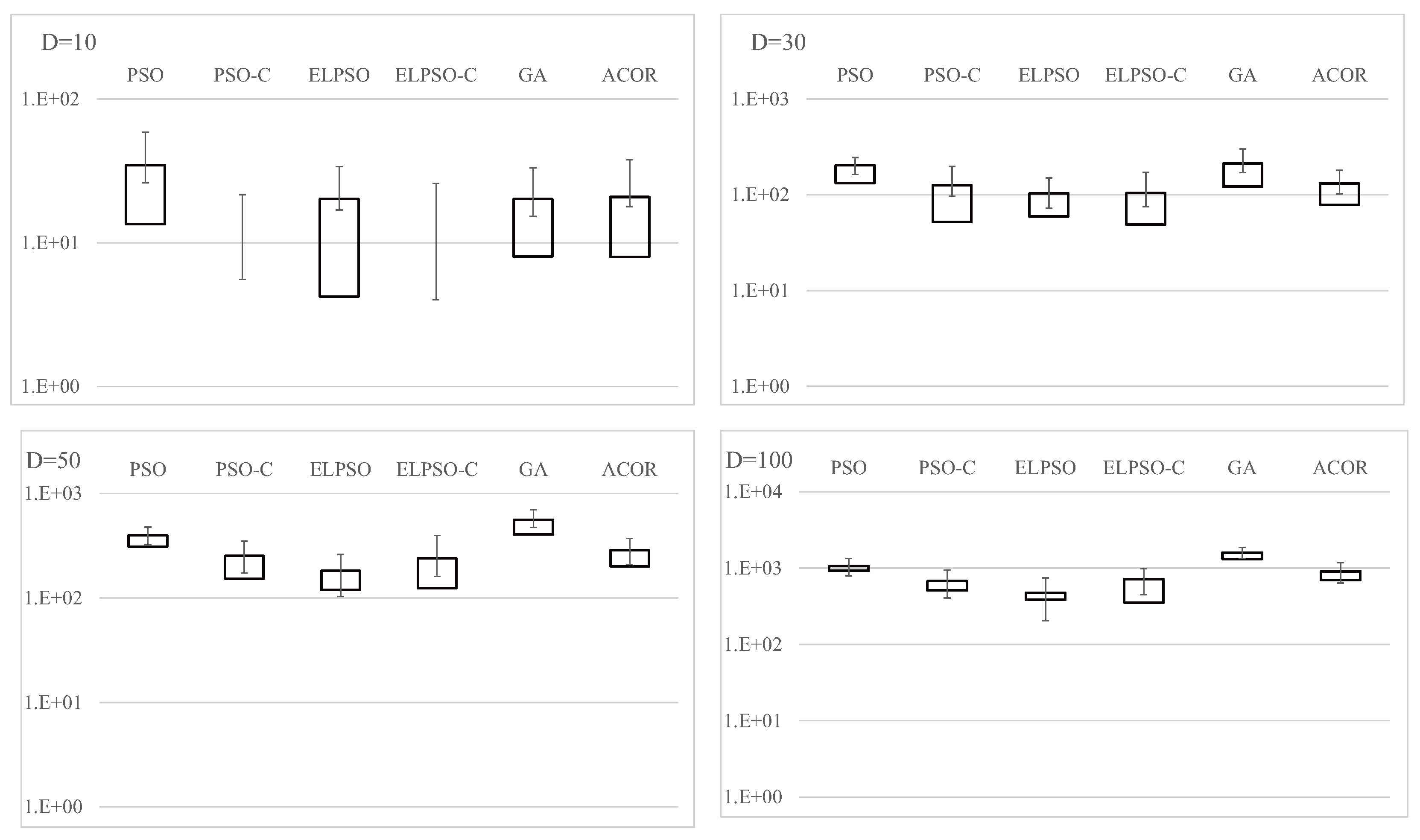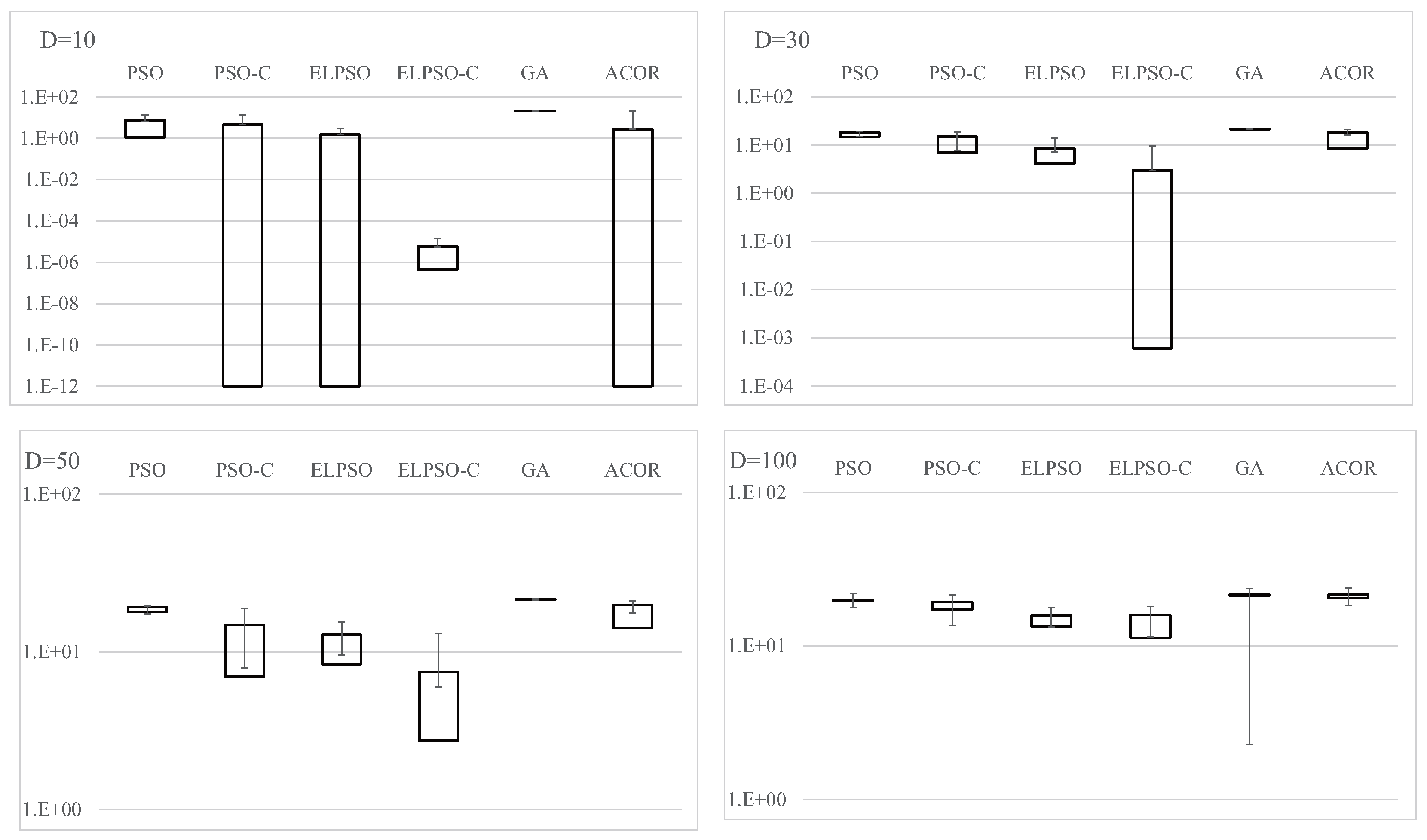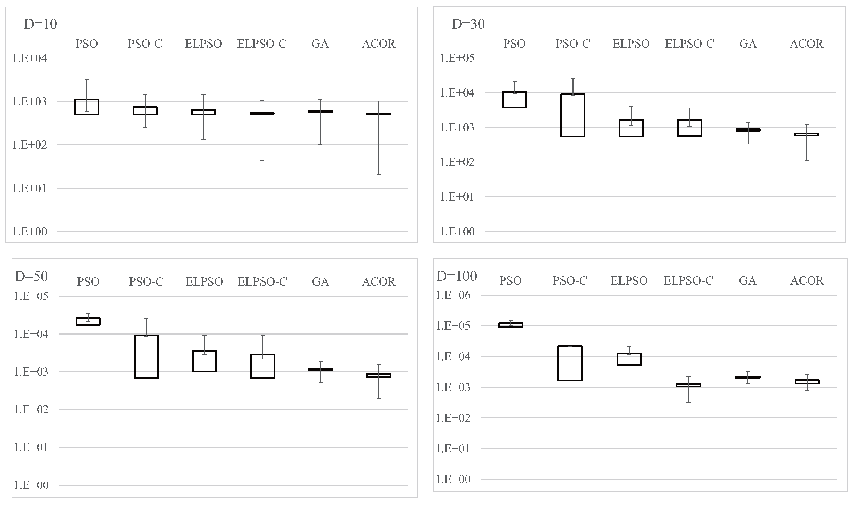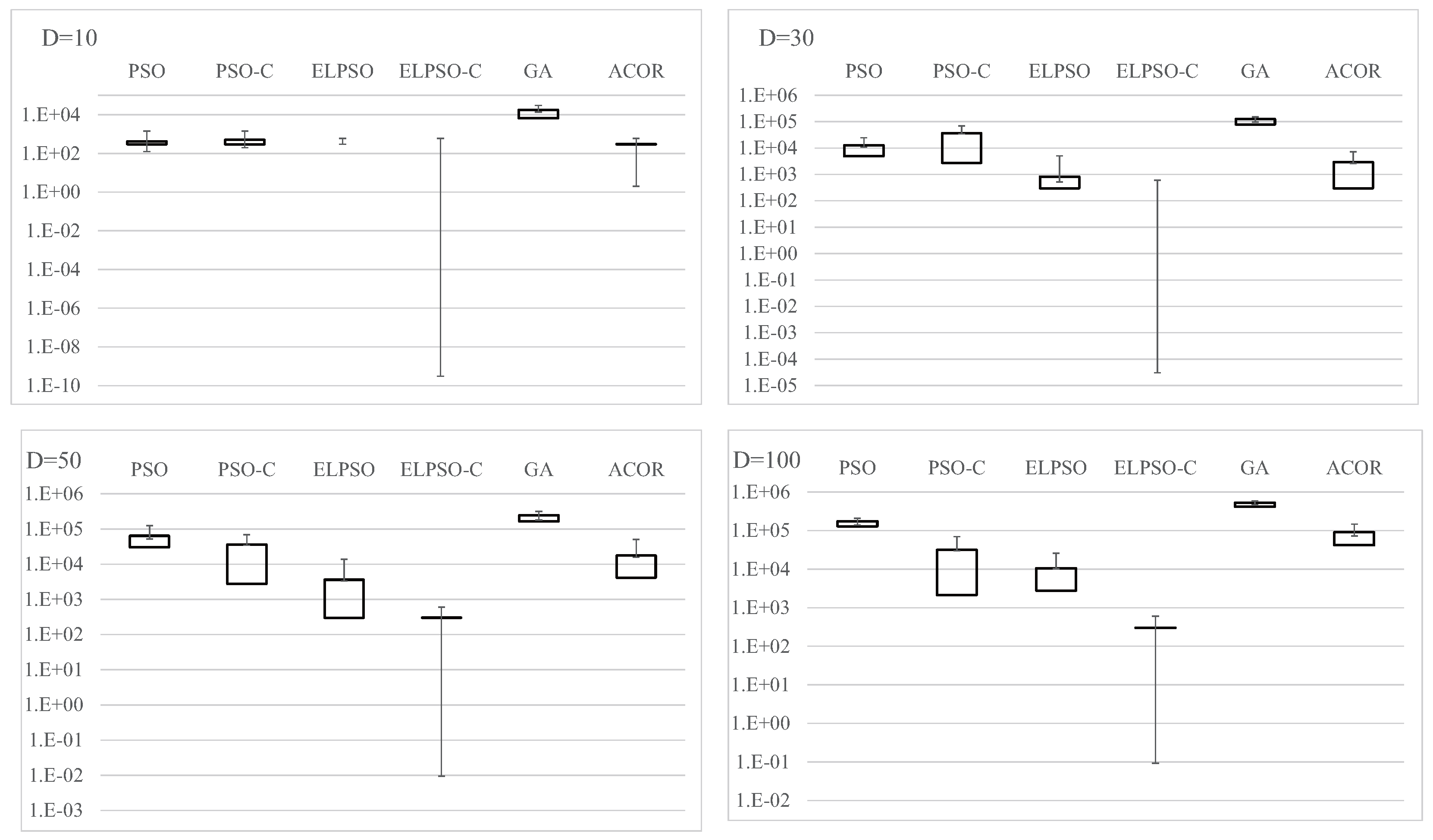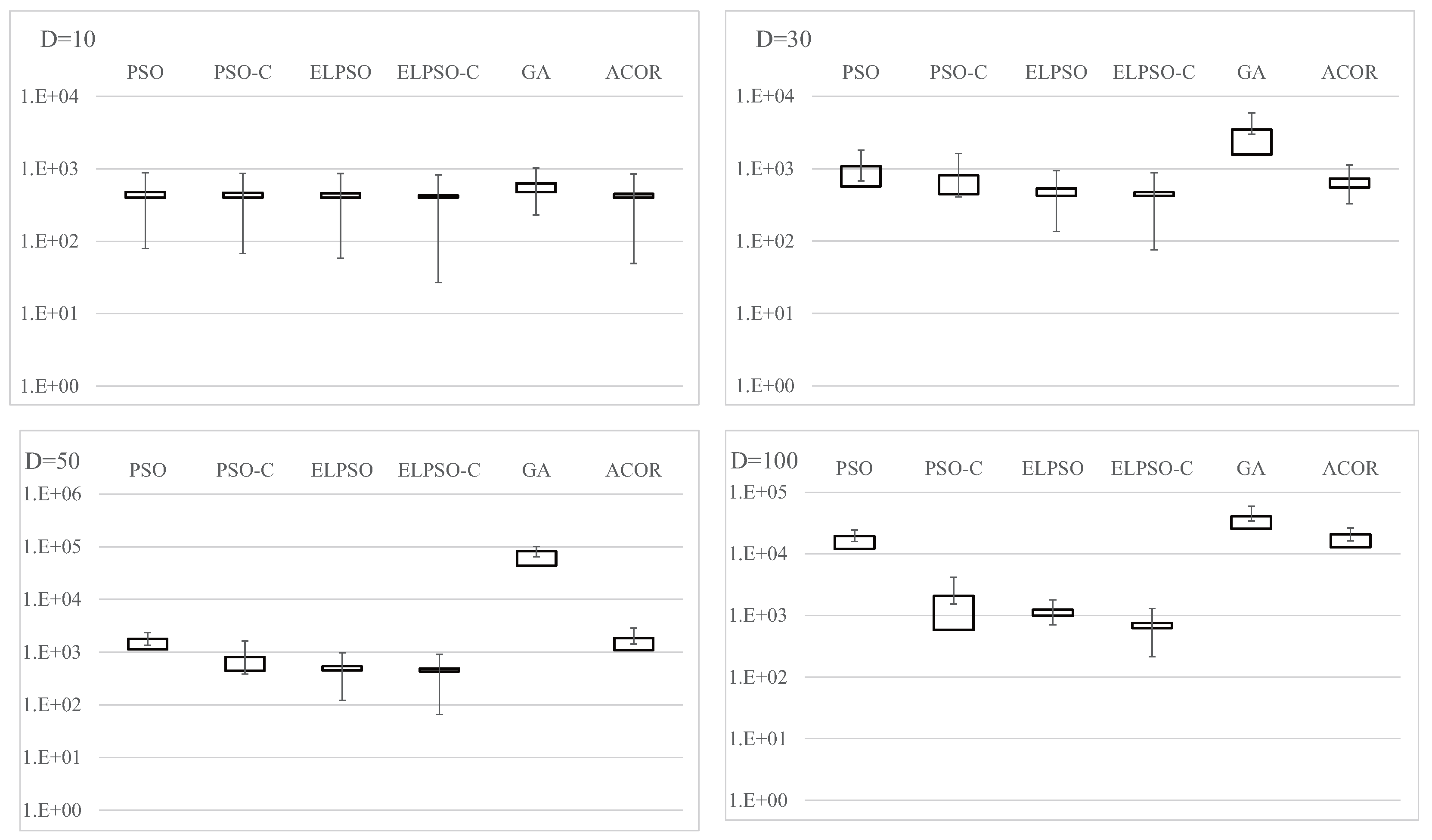 Results for F4, Schwefel’s problem 2.22, for , 30, 50, and 100 (30 trials).