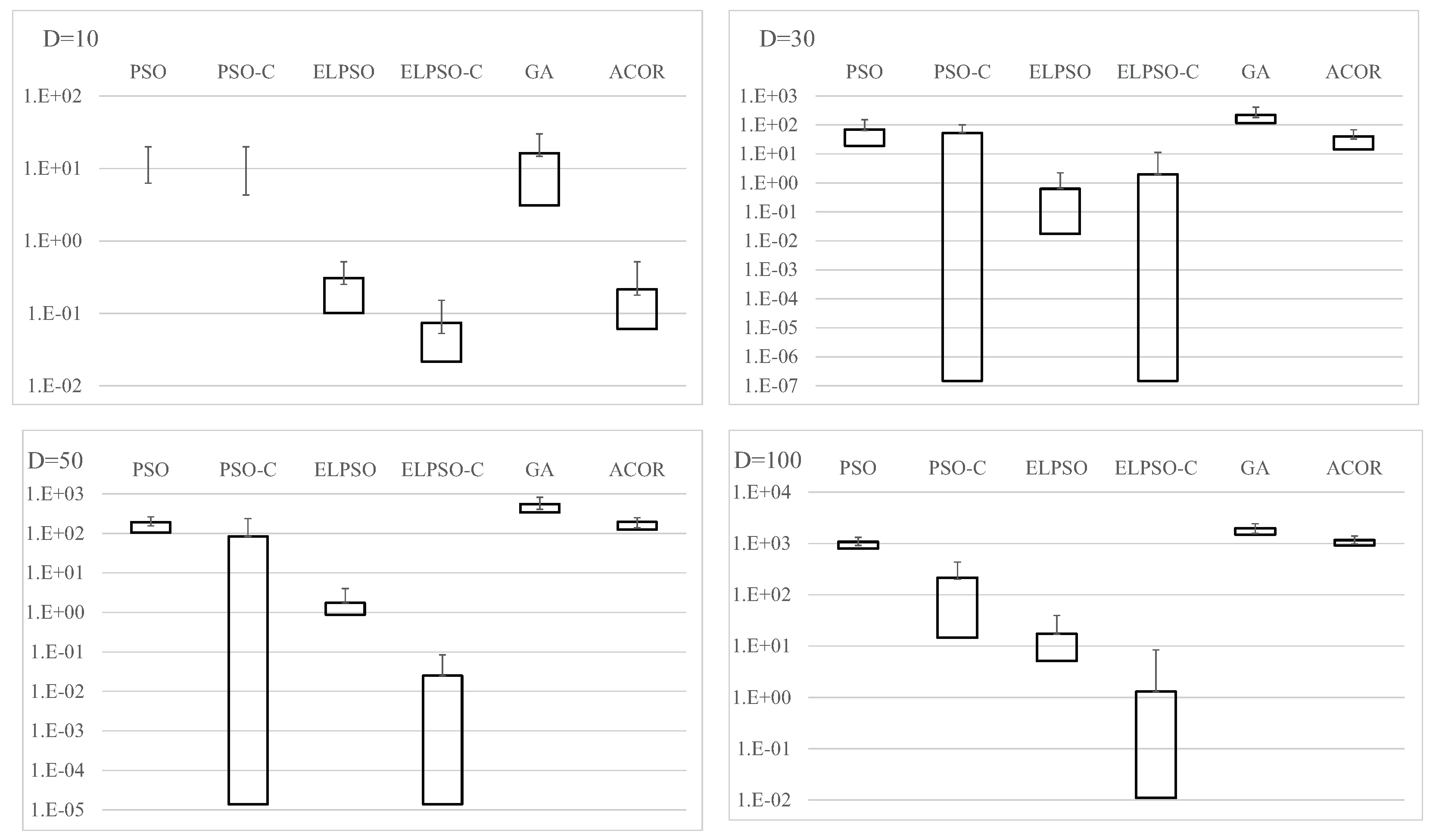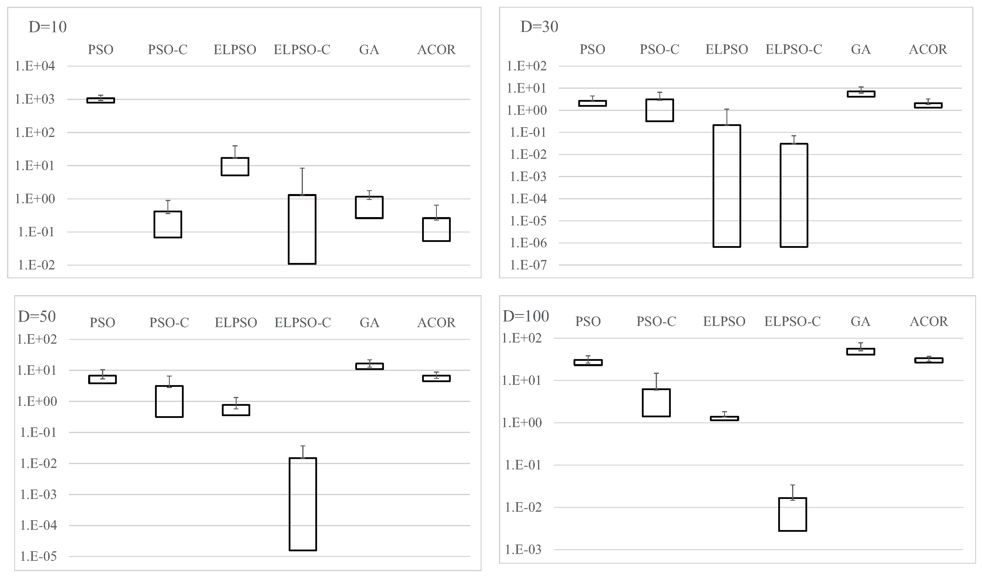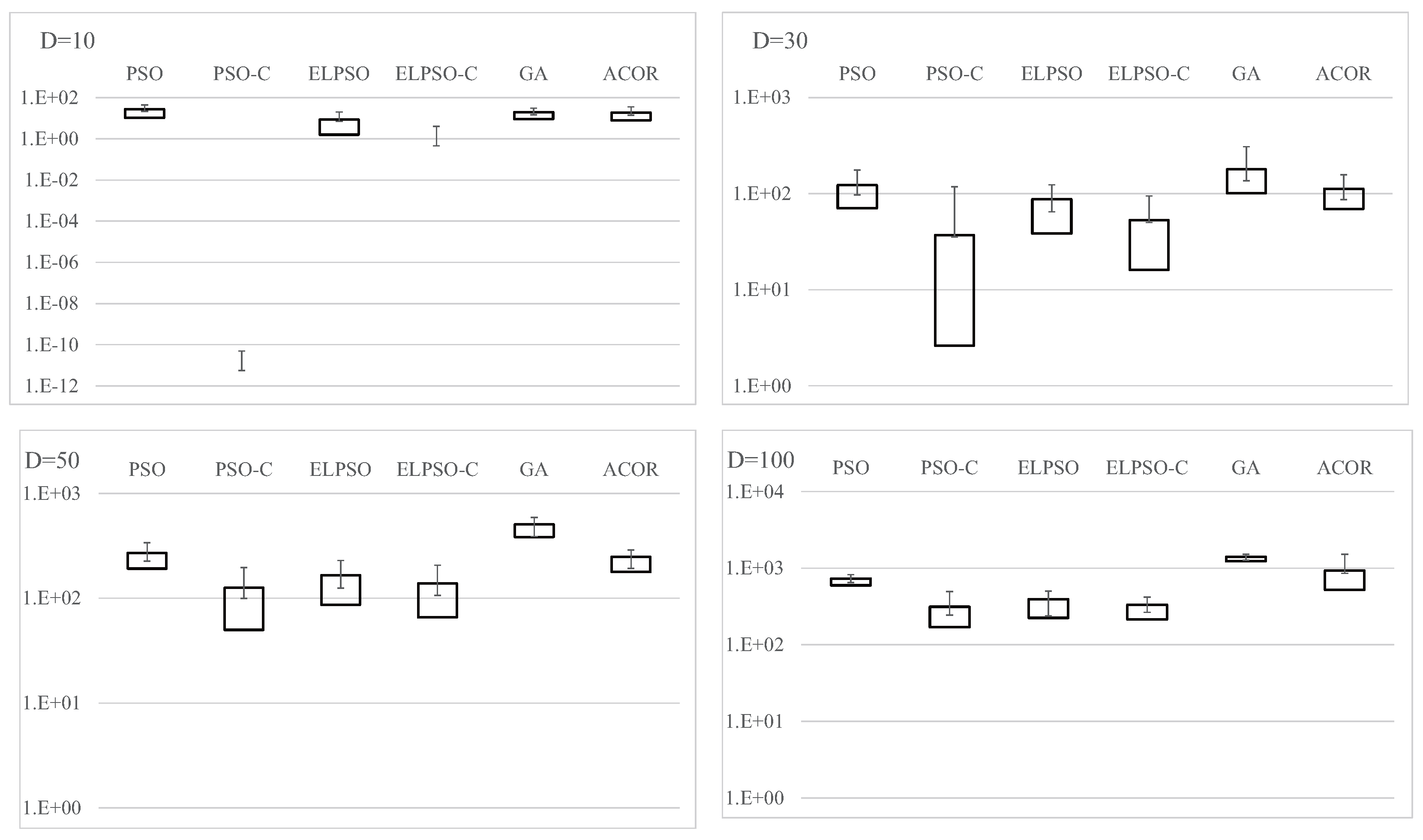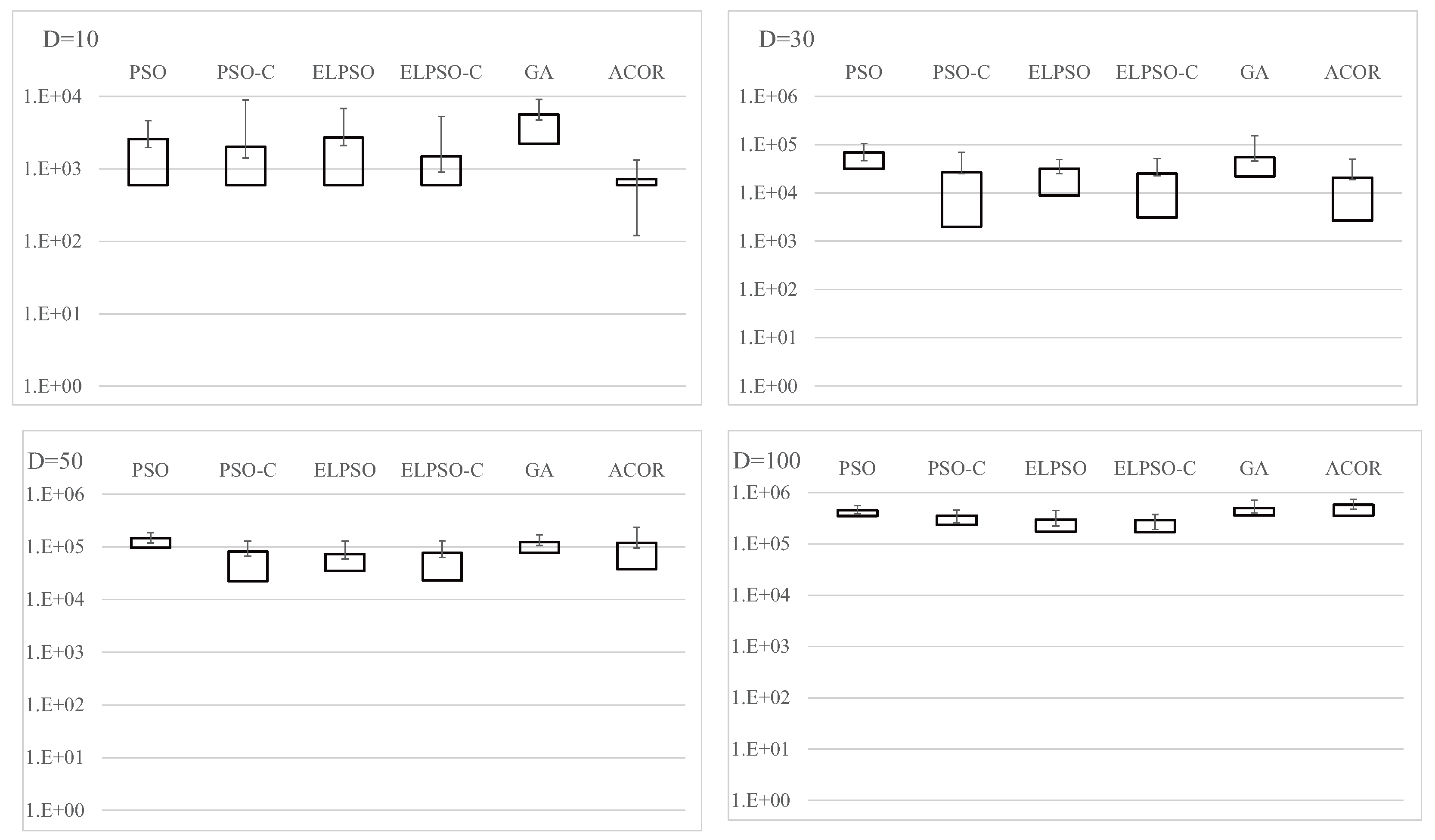 Results for F4, Schwefel’s problem 2.22, for , 30, 50, and 100 (30 trials).