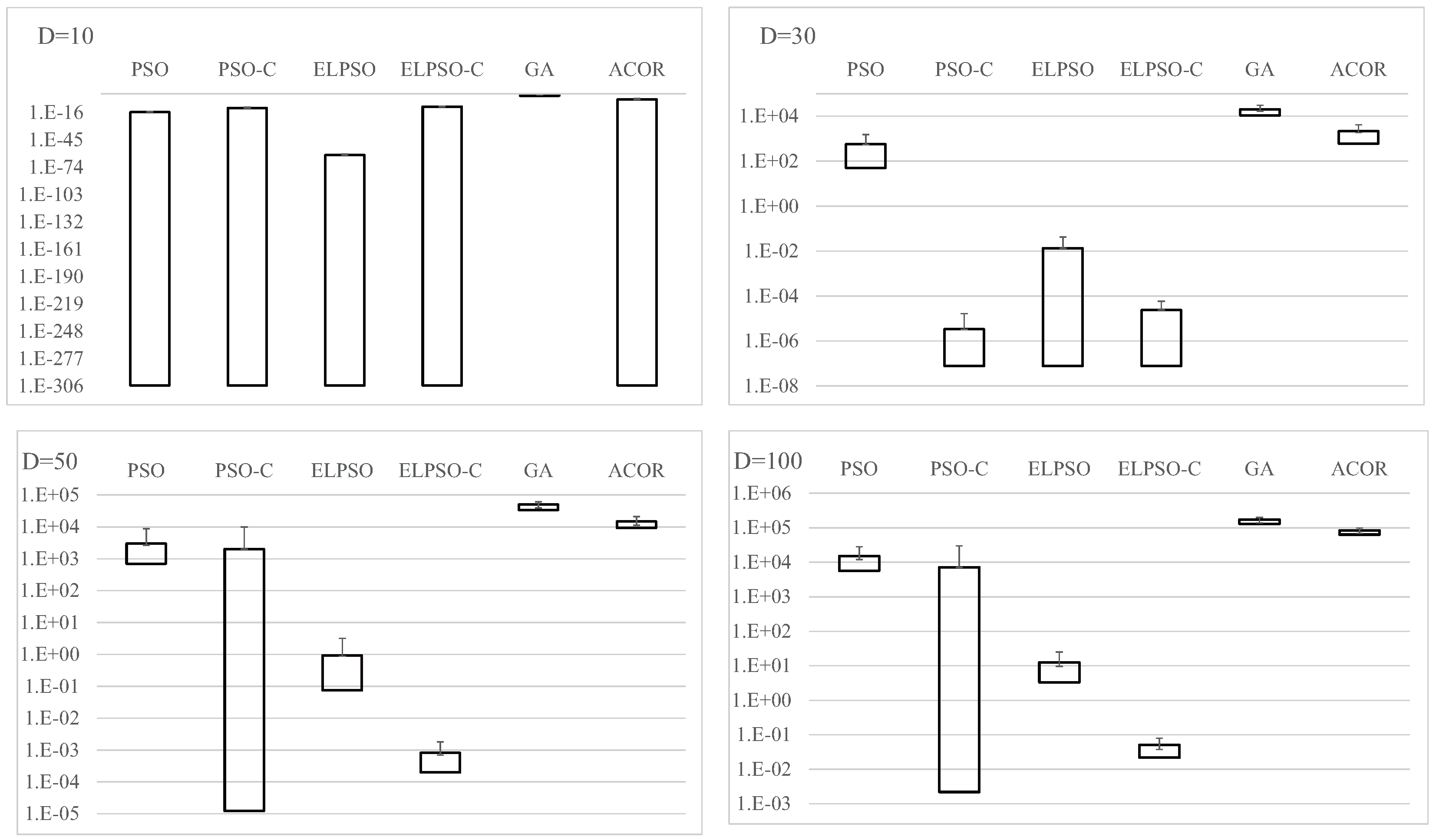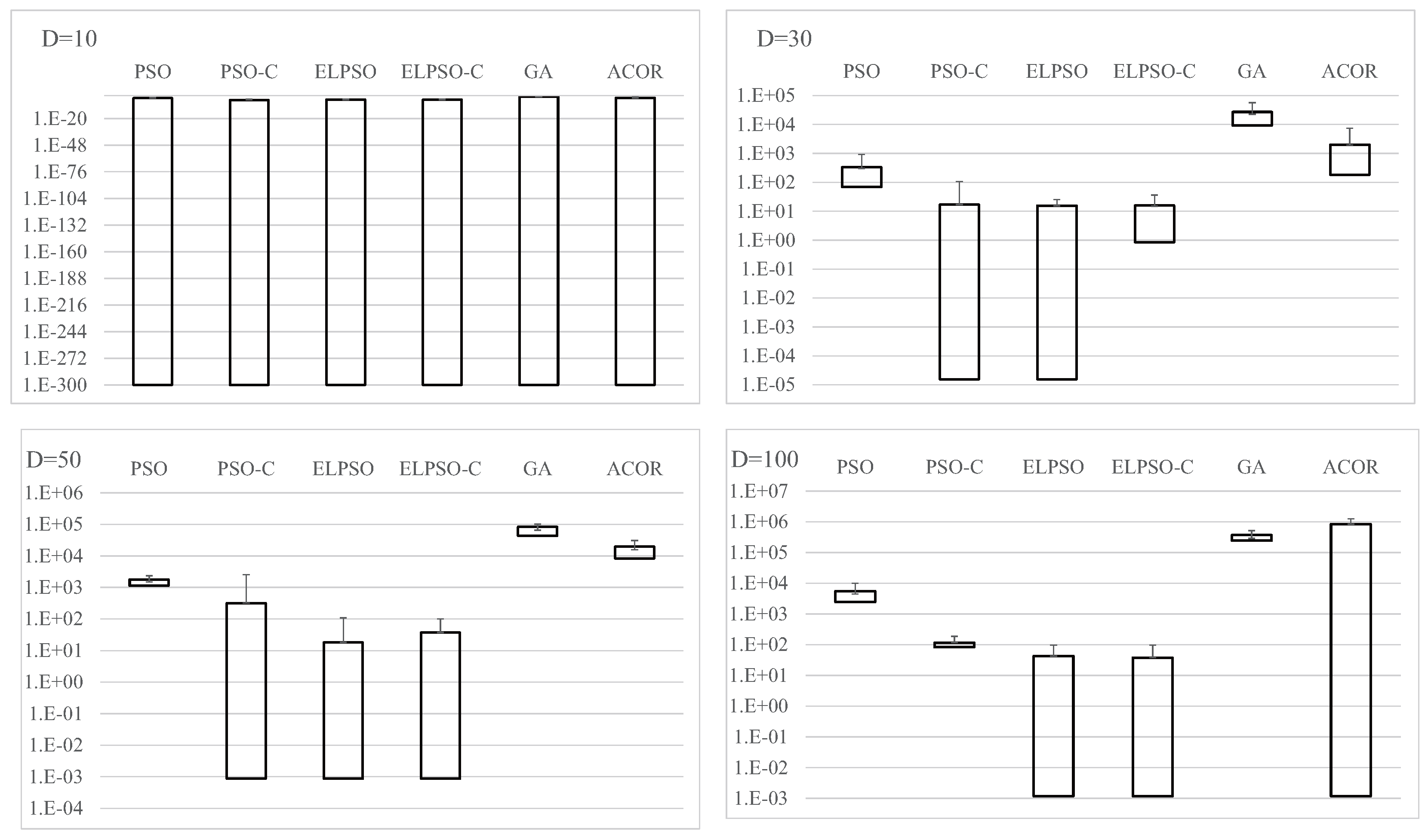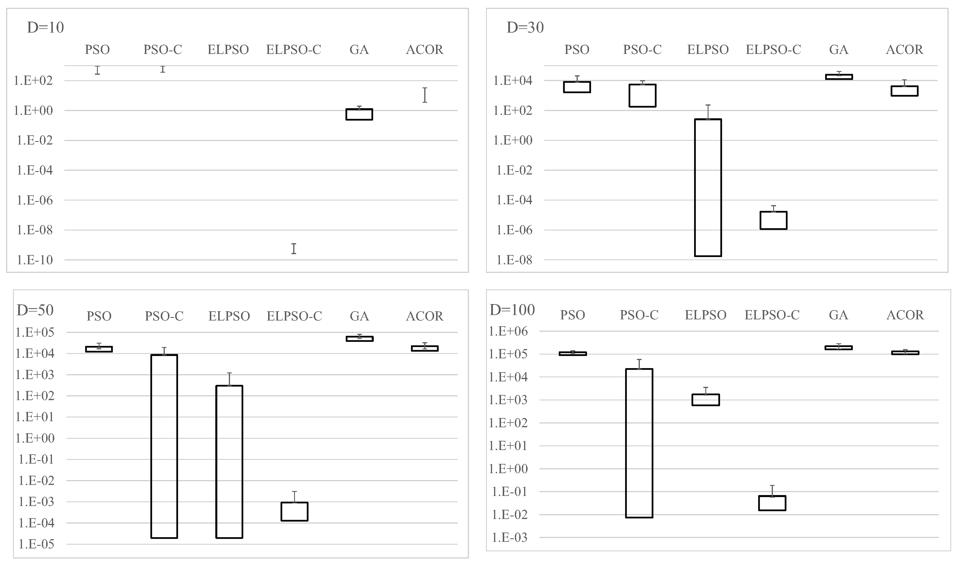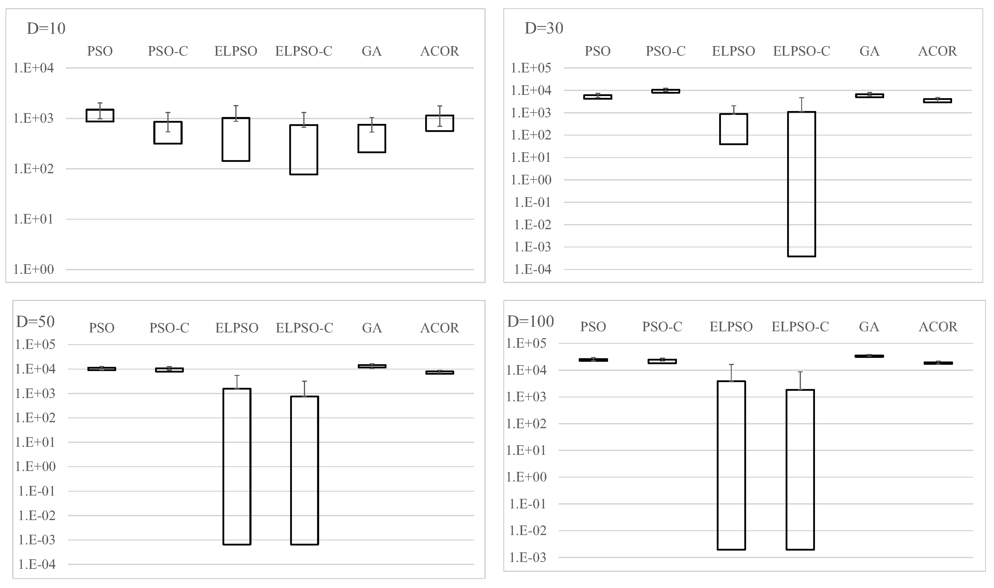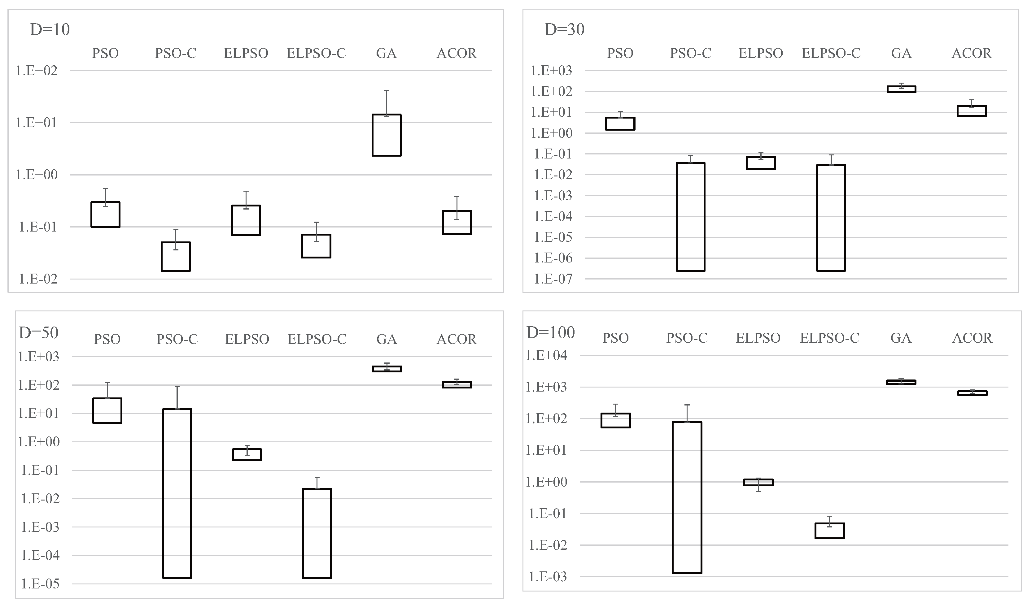 Results for F4, Schwefel’s problem 2.22, for , 30, 50, and 100 (30 trials).