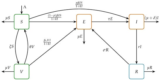 In this section, we describe the numerical simulations conducted to elucidate the dynamic behavior of the proposed SVEIR with the reinfection model, which incorporates the saturated infection rate and imperfect vaccination. We generate numerical simulations using the fourth-order Runge–Kutta method with a step size of . The parameters used are shown in Table 1.