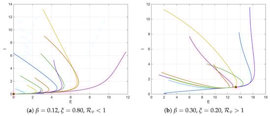 Figure 3 illustrates the phase-plane trajectories of the exposed (E) and infectious (I) populations simulated under diverse initial conditions to verify the global convergence properties of the system (1). The trajectories in Figure 3a correspond to the parameter sets and , for which . In this regime, all the solution paths monotonically converge toward the origin, indicating that the disease-free equilibrium (DFE) is globally asymptotically stable. This behavior confirms that any initial introduction of infection dies over time when vaccination coverage is sufficiently strong and the transmission rates are low. Conversely, Figure 3b displays the case of and , yielding . In this regime, all trajectories starting from distinct initial points approach the same positive endemic equilibrium (marked by a red dot), demonstrating global convergence to the endemic steady state.
