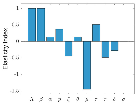 Figure 4 illustrates the elasticity indices of the effective reproduction number for all the model parameters. The recruitment rate () and transmission rate () exhibit the highest positive elasticities, implying that increases in these parameters lead to an increase in . The progression rate () and the fast-infection fraction (p) also show moderate positive elasticities, while waning immunity () and the vaccine risk reduction factor () have smaller positive impacts. Conversely, the vaccination rate (), recovery rate (r), and disease-induced mortality () display negative elasticities, with the natural death rate () being strongly negative, indicating that an increase in any of these parameters decreases . The reinfection parameter () has slight negative elasticity, suggesting a relatively minor direct influence on in this context. The low elasticity of supports previous findings [31] that reinfection is less significant than primary infection dynamics.
