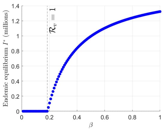 We examine the system in (1) to understand the behavior of the disease dynamics under varying conditions. We investigate how changes in the effective reproduction number, , affect the system’s equilibrium state.