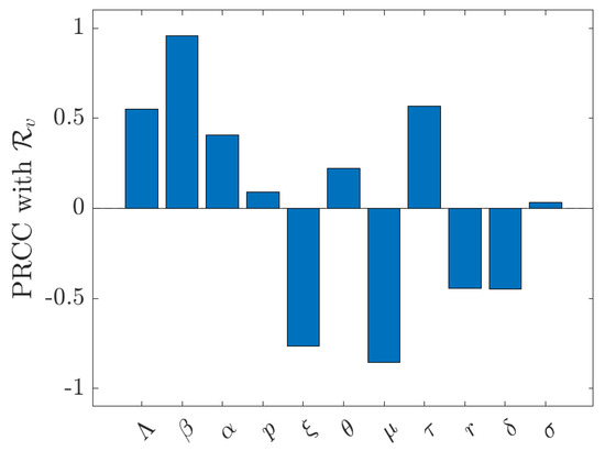 Partial rank correlation coefficients (PRCC) of with respect to model parameters.