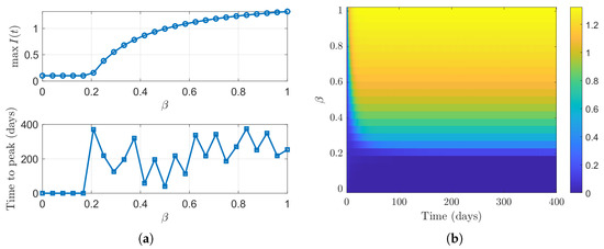 Sensitivity of the infectious class to variations in the transmission rate : (a) Peak value and timing of versus . (b) Heatmap of over time for varying .