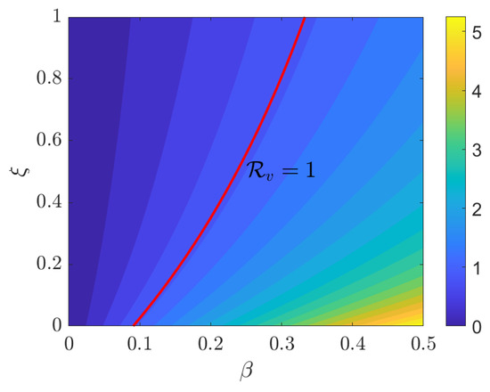 Figure 8 illustrates the contour map of as it varies with , where the red line marks the threshold at . As increases, this threshold shifts rightward, enlarging the area, where . However, an increase in tends to move the system towards . From an epidemiological perspective, high vaccination levels can counteract transmission pressure; however, the plot reveals that there is no universal, beta-independent vaccination level that ensures across the entire range of . Instead, for each specific value, there is a corresponding critical vaccination level , as indicated by the contour. Increasing reduces and permits a higher allowable value while remaining within the disease-free zone.