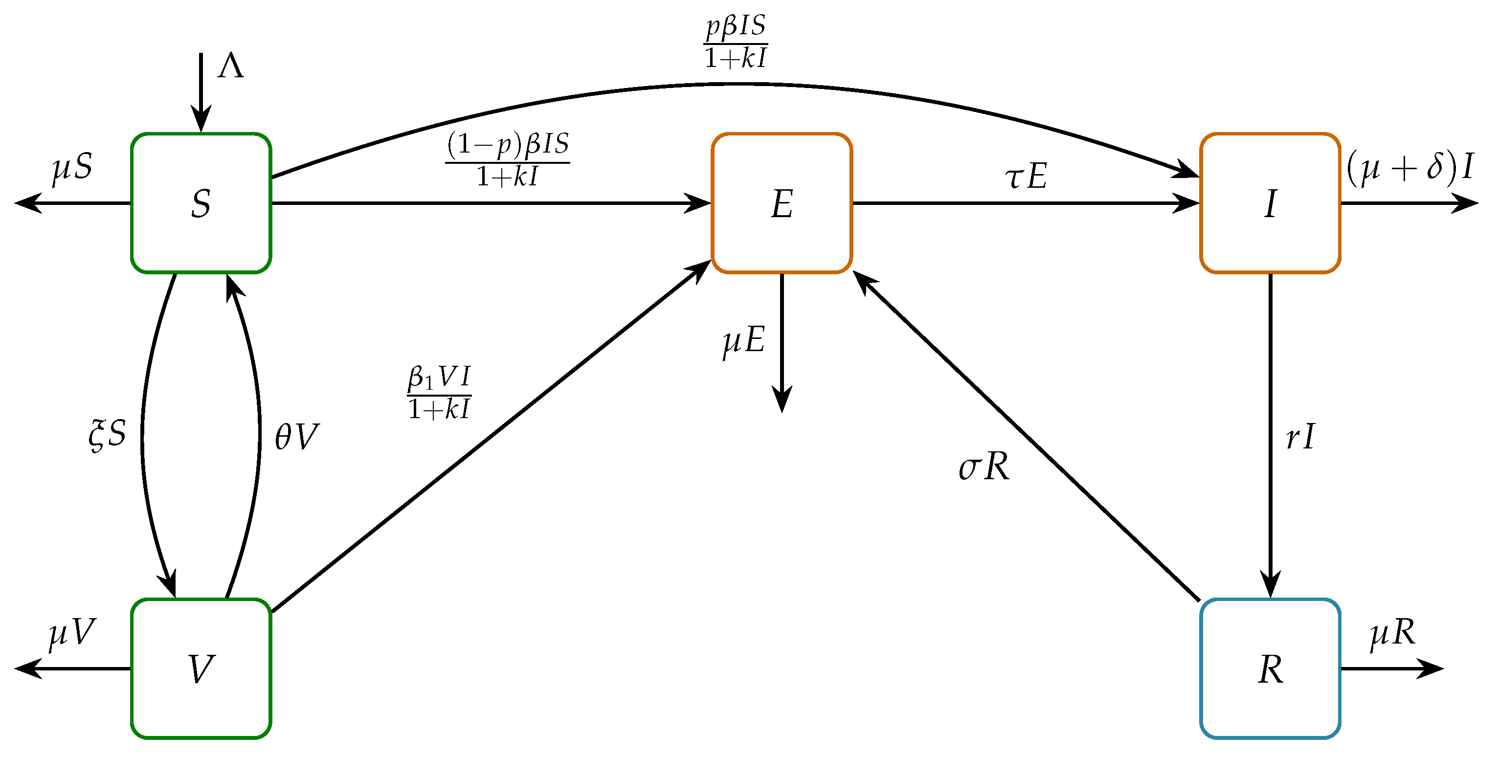 0 = Λ + θ V β I S 1 + k I ( ξ + μ ) S , 0 = ξ S β 1 V I 1 + k I ( θ + μ ) V , 0 = ( 1 p ) β I S 1 + k I + β 1 V I 1 + k I + σ R ( τ + μ ) E , 0 = p β I S 1 + k I + τ E ( r + δ + μ ) I , 0 = r I ( σ + μ ) R .