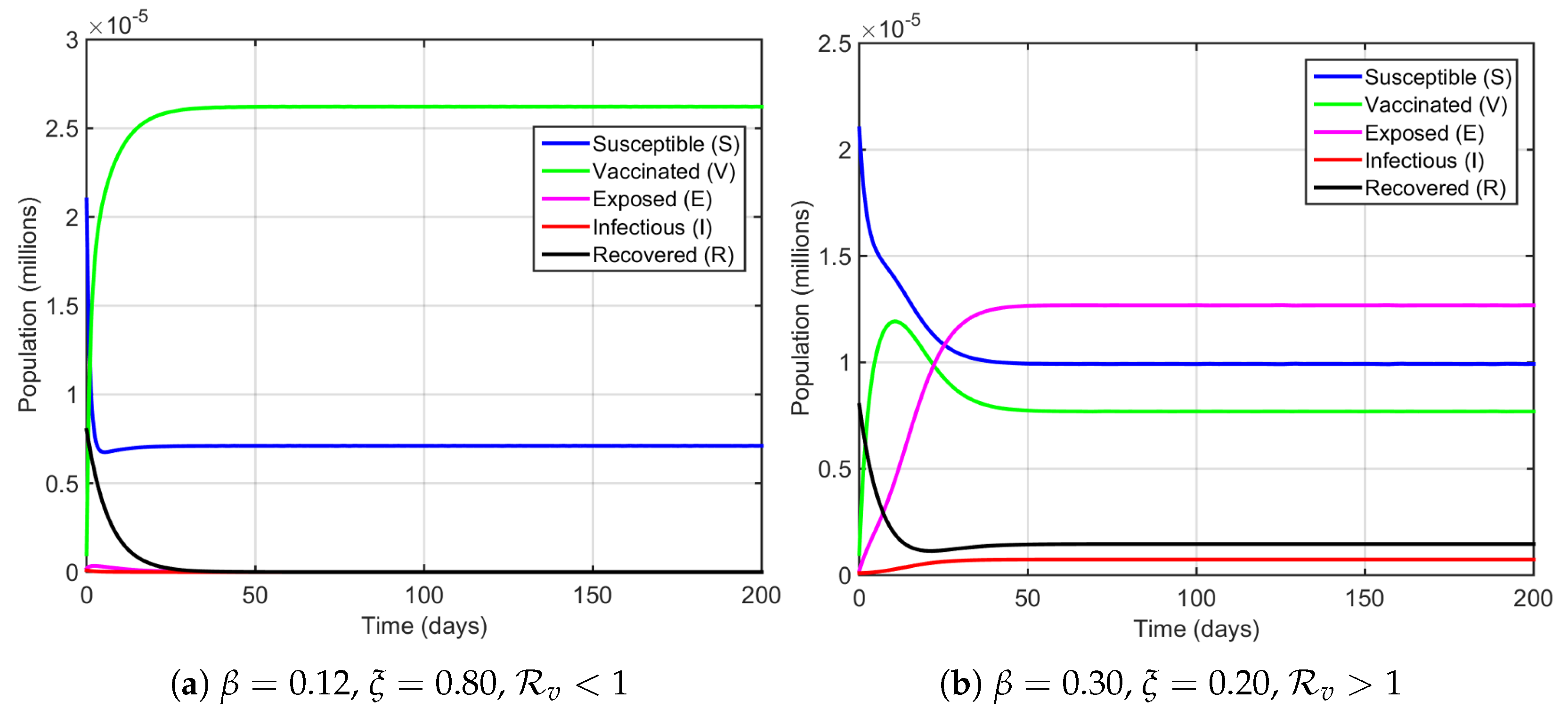 We examine the system in (1) to understand the behavior of the disease dynamics under varying conditions. We investigate how changes in the effective reproduction number, R v , affect the system’s equilibrium state.
