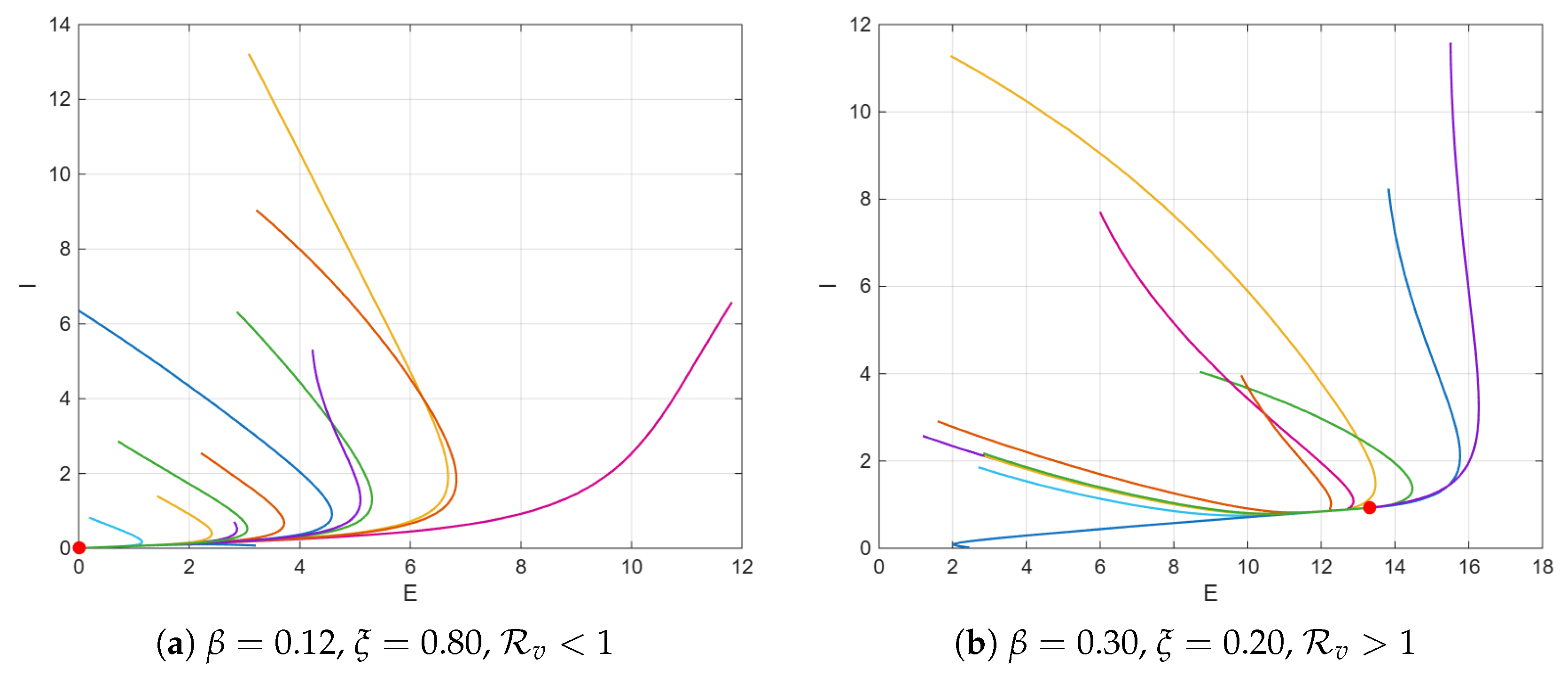 Figure 3. Phase-plane trajectories in the ( E , I ) -plane from multiple initial conditions showing global convergence of (a) DFE and (b) EE. The red dots denote the corresponding equilibrium points.