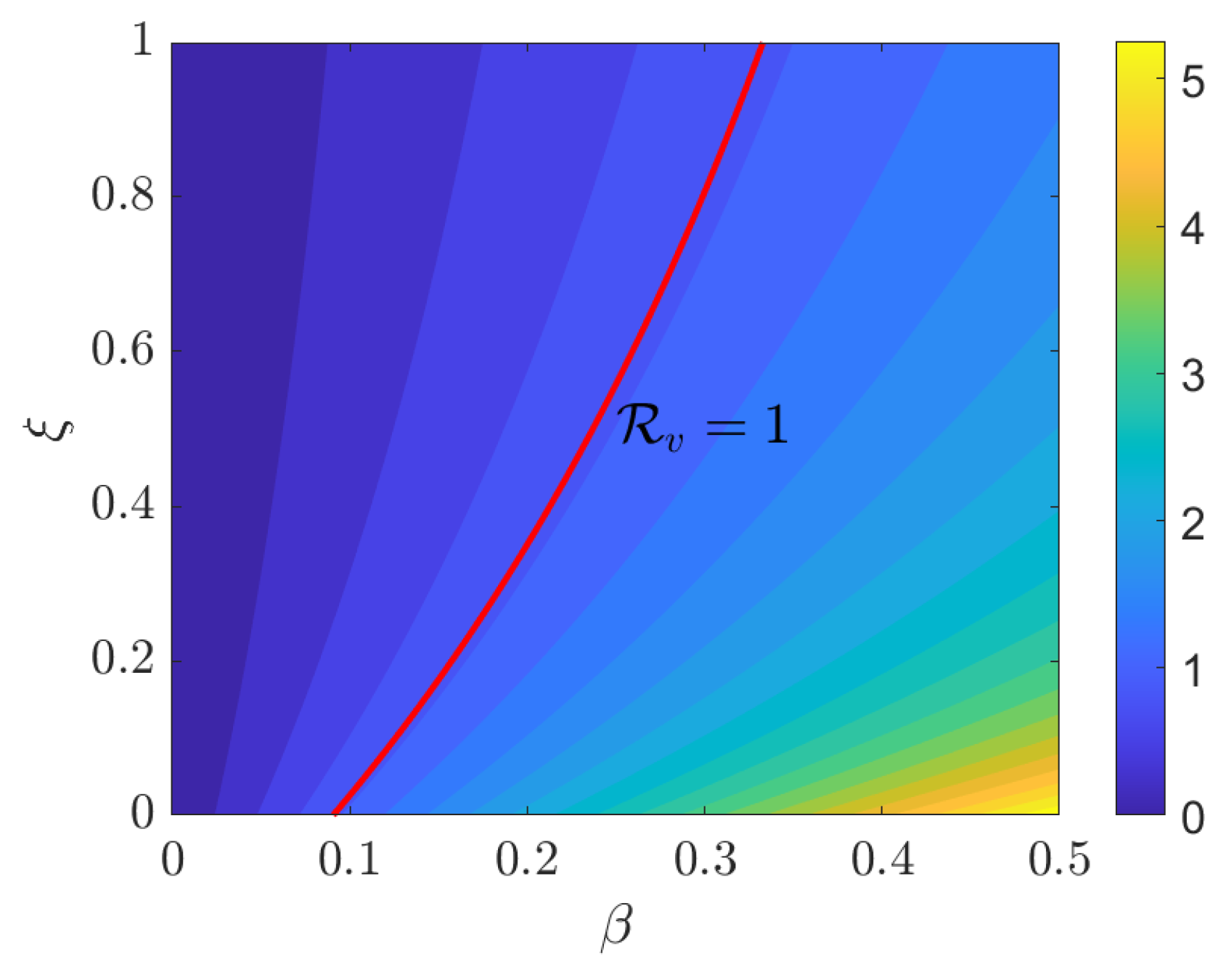Figure 8. Contour plot of the effective reproduction number R v as a function of the transmission rate β and vaccination rate ξ . The red curve represents the threshold R v = 1 .