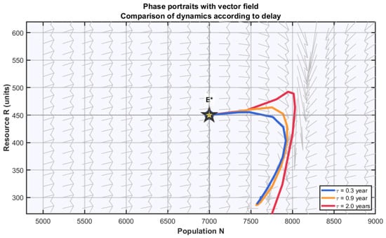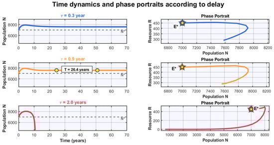 Recent advances in delay differential equations have provided new computational and theoretical tools for analyzing complex dynamical systems. Alyoubi et al. [11] developed efficient numerical methods for DDEs with classical initial conditions, while El-Zahar et al. [12,13] explored computational approaches for DDEs with history functions, demonstrating the importance of proper initialization in delay systems. Our work complements these methodological advances by applying DDE theory to coupled population–resource systems with multiple distinct delays, extending the classical framework to capture both perception and decision-making delays in ecological contexts.
