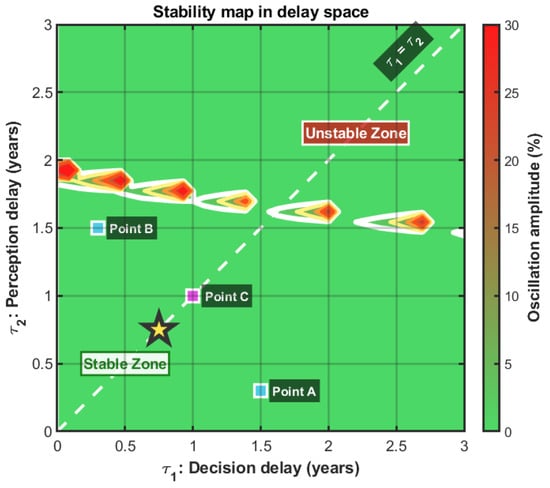 While previous studies have examined delay effects in resource systems, most consider single delays or focus on specific delay types in isolation. Kar and Matsuda [14] studied fishery models with harvesting delays, and Liu and Meng [15] analyzed multi-species systems with multiple delays, but these works do not systematically compare the differential impacts of perception versus decision delays. Our model uniquely integrates two distinct delays simultaneously—one for decision-making (), representing administrative and implementation lags, and one for resource perception (), capturing monitoring and observational constraints—and analyzes their differential and combined impacts on system stability. Furthermore, existing models rarely provide quantitative thresholds with direct management applicability. Our contribution fills this gap by (i) establishing explicit critical delay thresholds beyond which instability emerges, (ii) demonstrating the counterintuitive result that asymmetric delay distributions can be more stabilizing than symmetric ones, and (iii) providing actionable recommendations for optimizing monitoring and decision processes in natural resource management.
