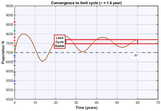 MacDonald [5] established the foundations of stability analysis for biological equations with delays. Gopalsamy [6] focused on oscillations in delayed population models, while Kuang [7] developed a systematic approach for applications in population dynamics. Recent advances have extended these classical approaches to incorporate memory effects through fractal–fractional calculus. Zeeshan et al. [8] investigated a fractal–fractional-order modified predator–prey model with immigrations, demonstrating how non-integer order derivatives capture intricate memory phenomena in ecological systems. Similarly, Shah et al. [9] examined fractal–fractional coupled systems with constant and state-dependent delays, revealing complex dynamics in ecological applications; while these fractal–fractional approaches provide powerful tools for modeling memory effects through non-integer derivatives, our work focuses on classical delay differential equations that explicitly represent institutional and monitoring lags in resource management. Both frameworks complement each other: fractal–fractional models excel at capturing distributed memory effects, while our explicit delay formulation directly corresponds to measurable administrative and decision-making timescales. More recently, Ruan [10] examined bifurcations in epidemiological systems with delays.
