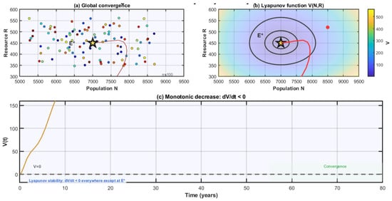 The eigenvalue (under viability assumptions) indicates instability with respect to population perturbations. However, if exploitation efficiency exceeds a critical threshold , the coexistence equilibrium ceases to exist, and becomes the relevant attractor for trajectories with small initial population densities. The stability of thus depends on parameter regimes and represents scenarios of overexploitation where populations cannot sustain themselves.