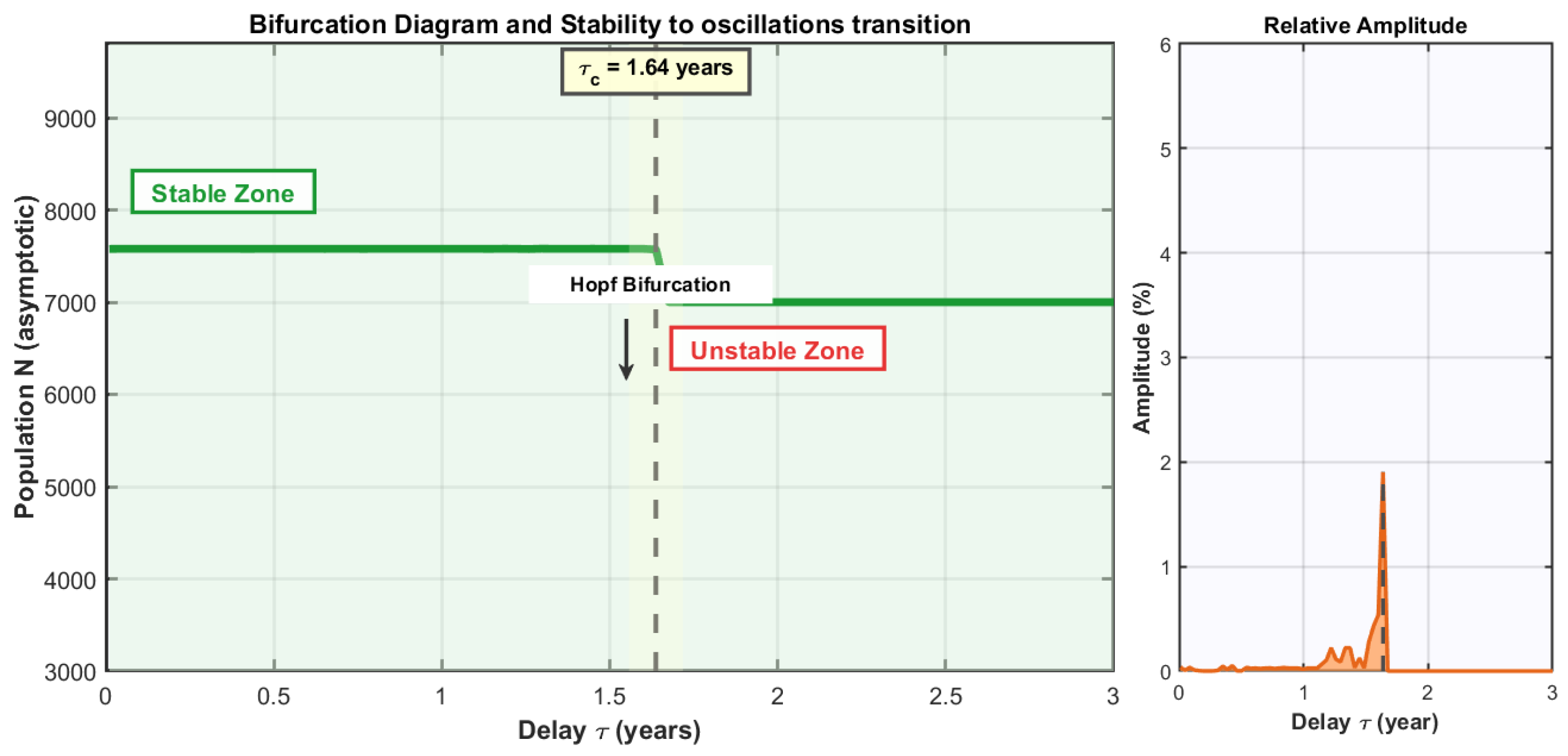 The amplitude of oscillations in the unstable regime is another striking aspect. For years, we observe excursions that bring the population to less than 15% of its equilibrium value. Such fluctuations would be catastrophic in a real context, suggesting that systems operating with cumulative delays in the order of 2 years or more are inherently vulnerable to cyclical demographic collapses.
