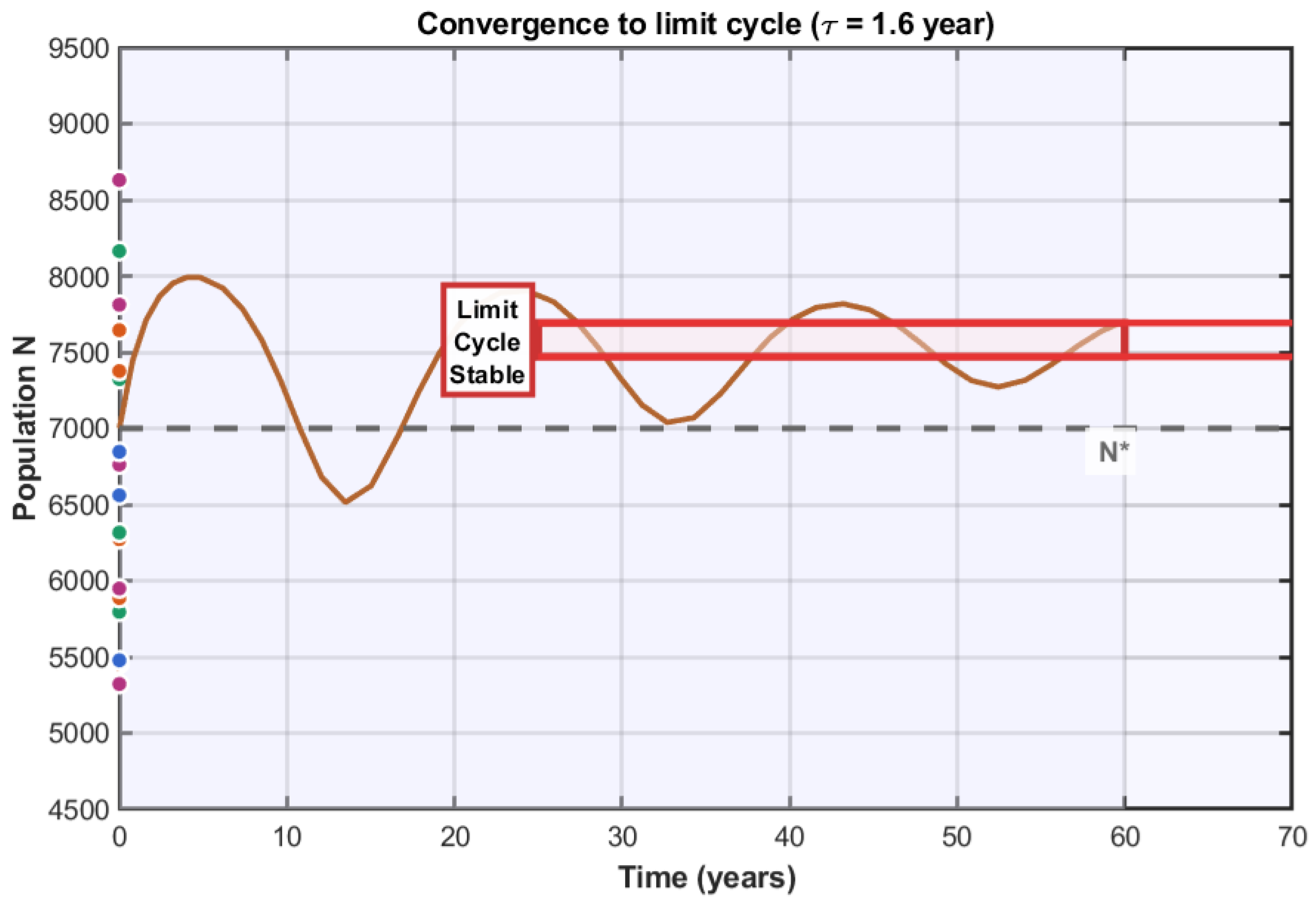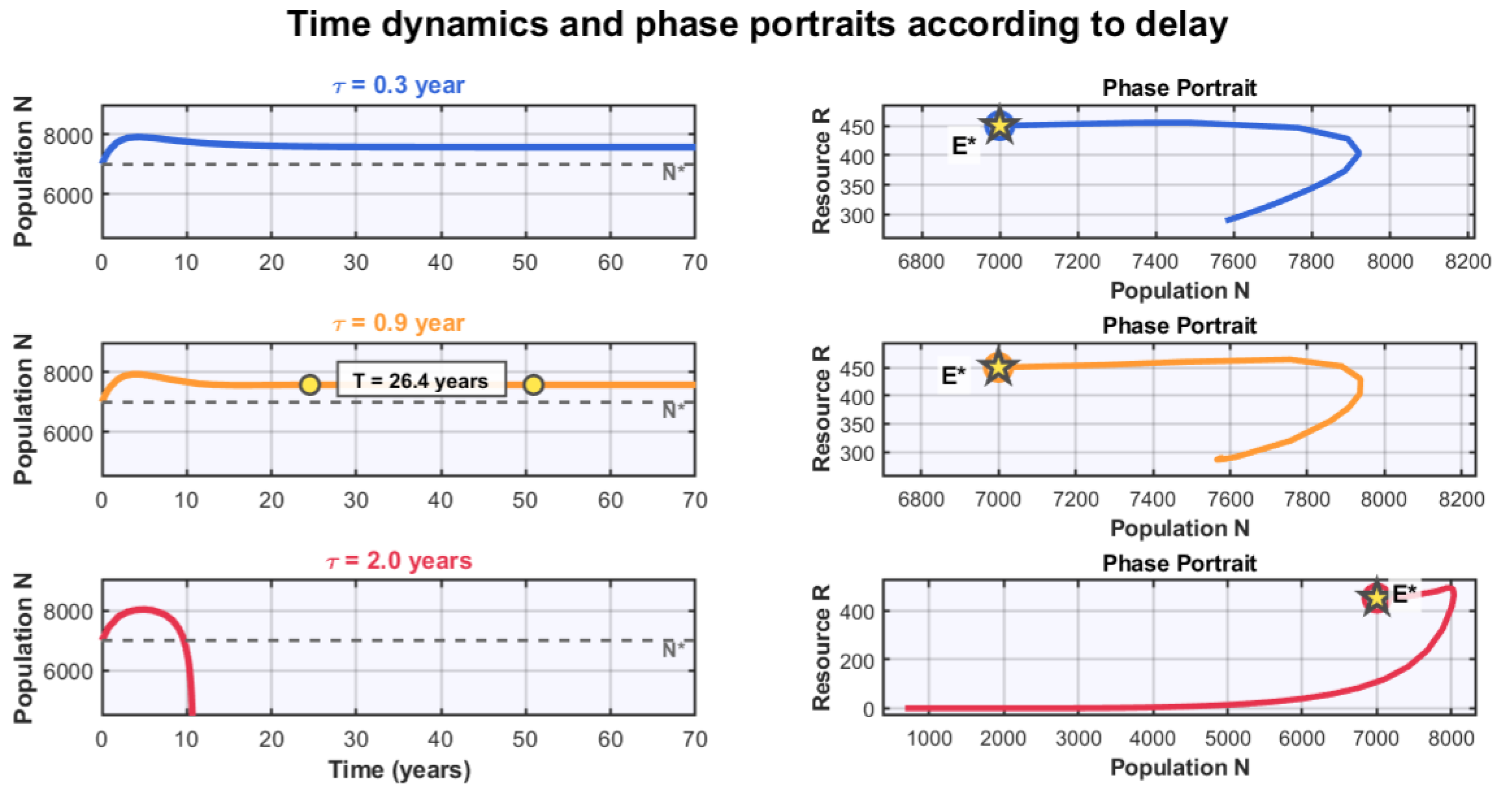 For the case where years, we observe that the limit cycle extends over a much wider region of state space. Notably, the trajectory approaches dangerously close to the axis , suggesting that an even larger delay could lead to extinction. This observation raises the question, not explored in this work, of basins of attraction and the possibility of catastrophic extinctions for very high delays.