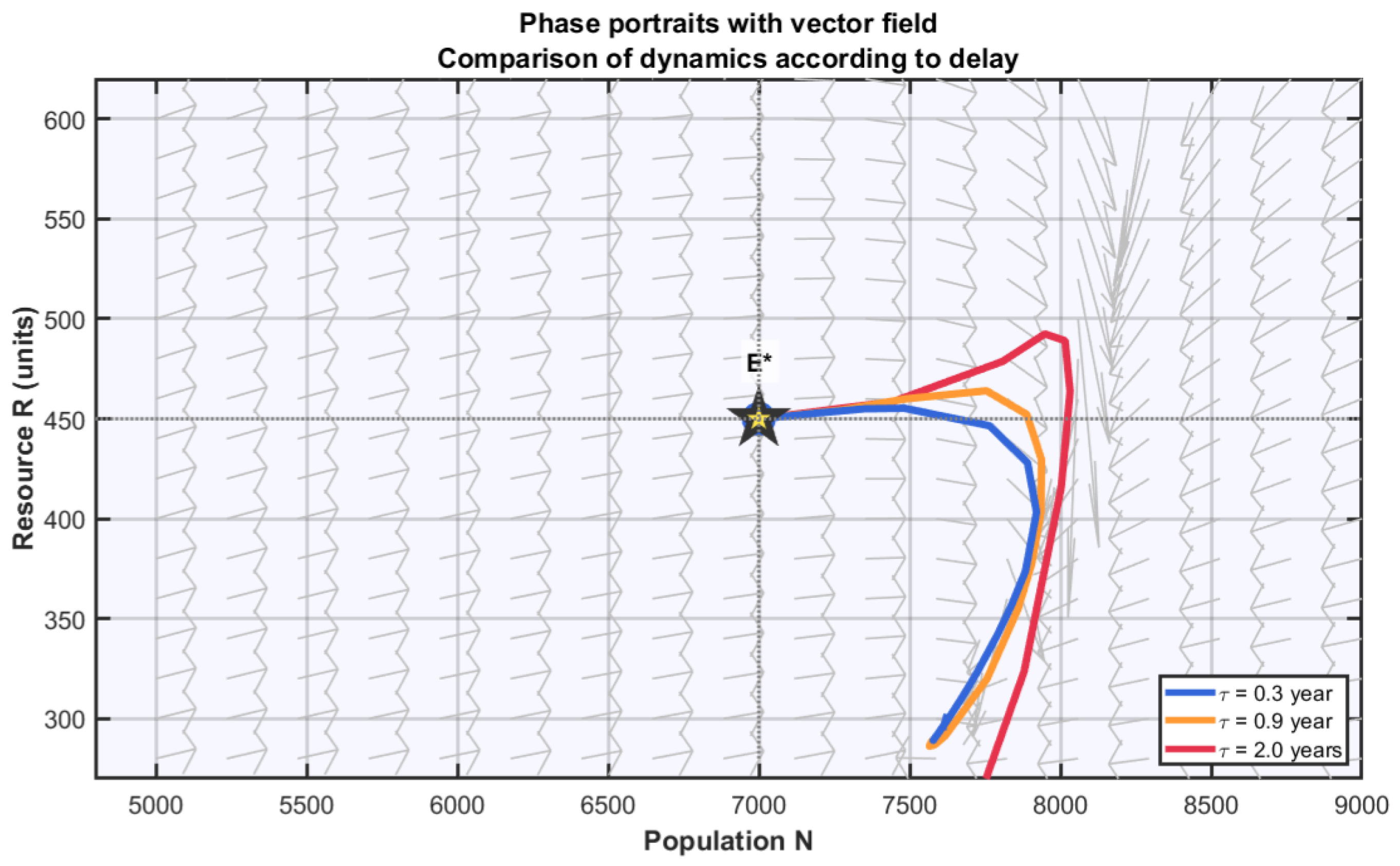 This geometric representation reveals several important aspects of dynamics. First, we clearly see that equilibrium point is a saddle point for delay values above the critical threshold: trajectories move away from it in certain directions while being attracted in others. The vector field shows a counterclockwise rotational structure around the equilibrium, consistent with the spiral nature of trajectories.