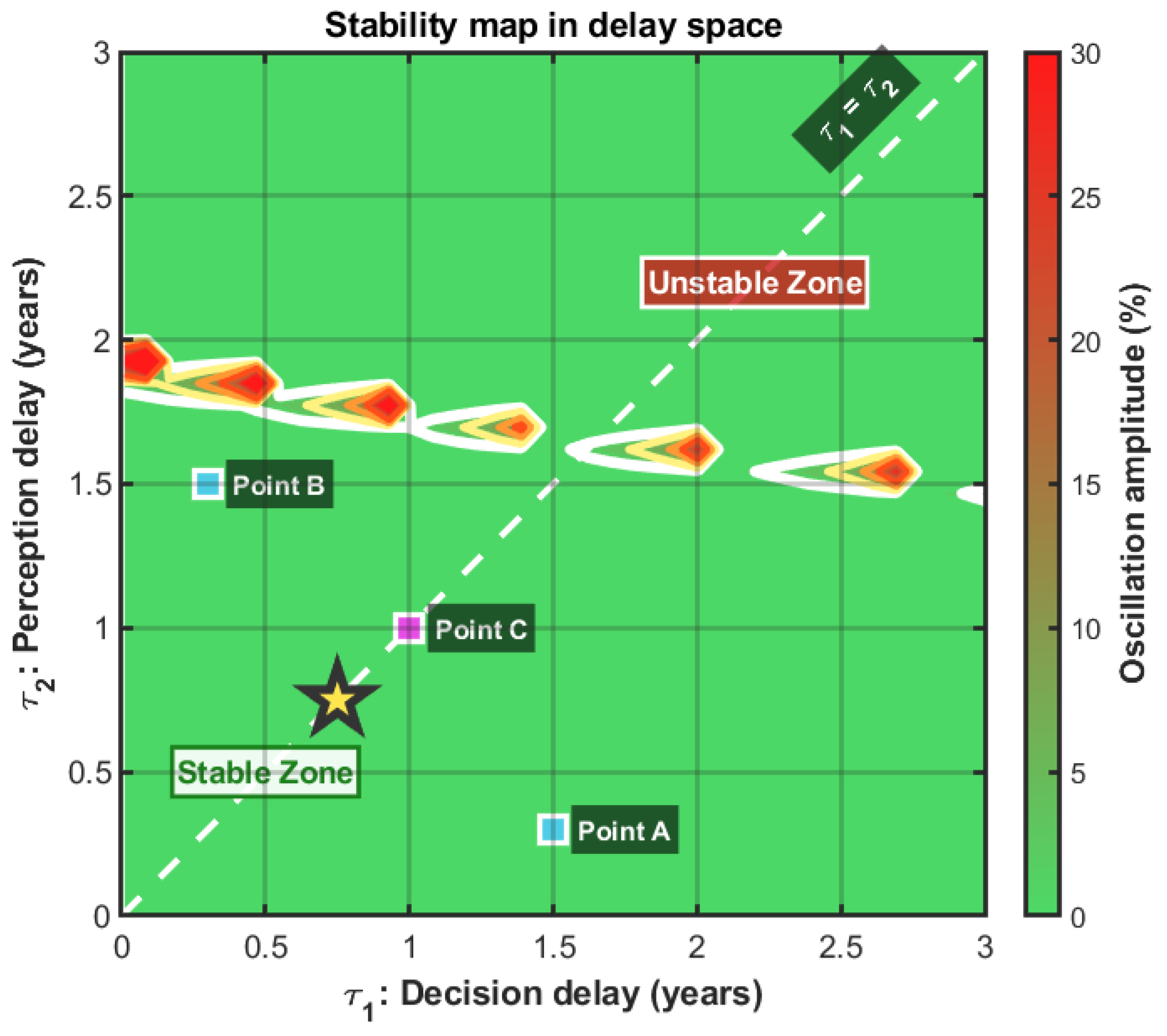 Along the diagonal , we find our critical threshold of about 1.64 years, but away from this diagonal, behavior changes. If we fix years (short perception delay) and progressively increase , the system remains stable up to values of reaching 1.5–1.8 years. Similarly, if we fix years and increase , we can go up to 1.6–1.8 years before losing stability.