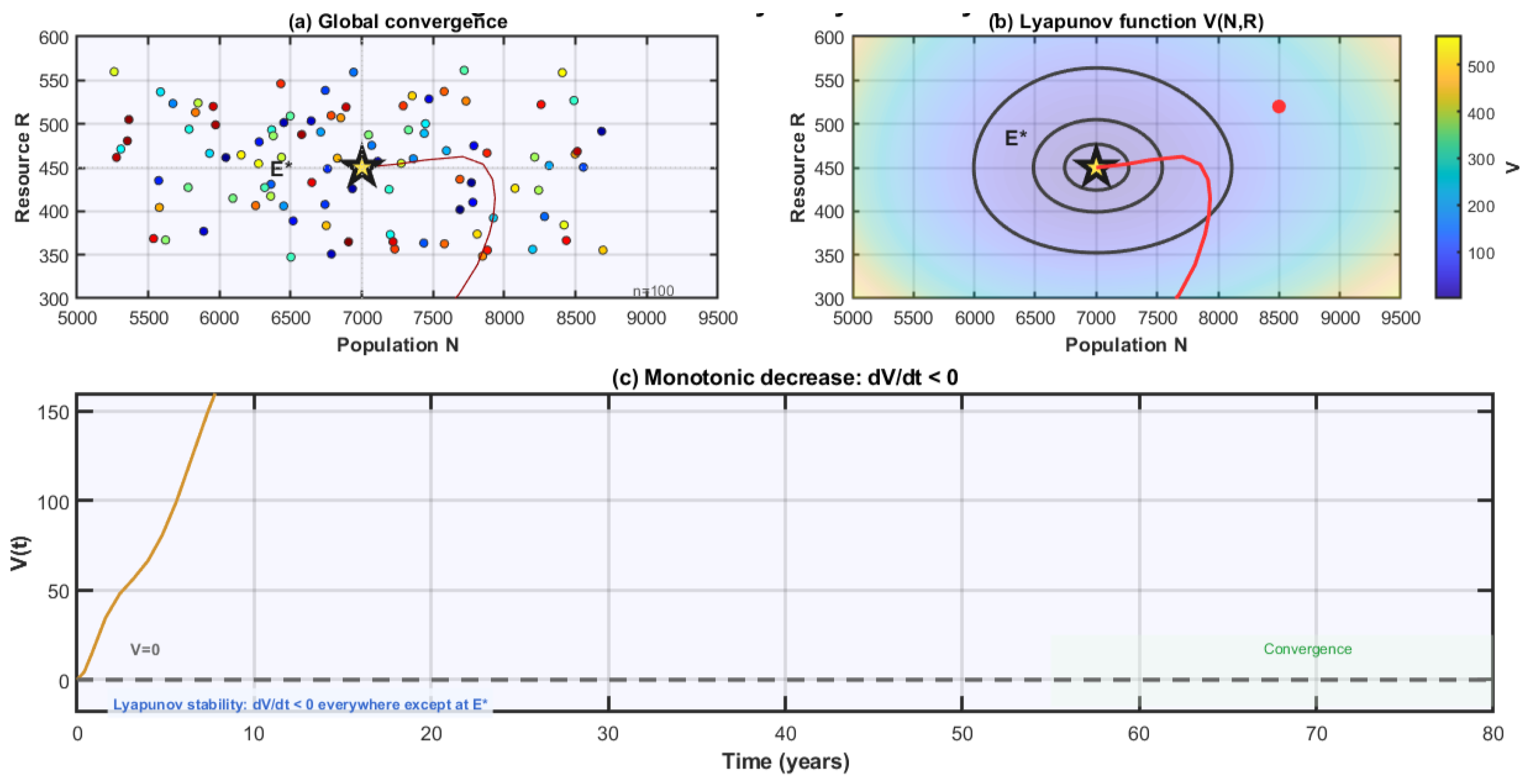 Limitations: (i) The model assumes spatial homogeneity, neglecting the patchy resource distributions and population dispersal that characterize many real ecosystems. (ii) The age structure is not explicitly modeled, though it significantly influences recruitment dynamics in many harvested populations. (iii) Environmental stochasticity (weather variability, environmental fluctuations) is excluded from this deterministic framework. (iv) We consider single-species exploitation, whereas real systems often involve multiple competing or interacting populations. (v) The model does not account for adaptive human behavior or learning effects in resource exploitation strategies.