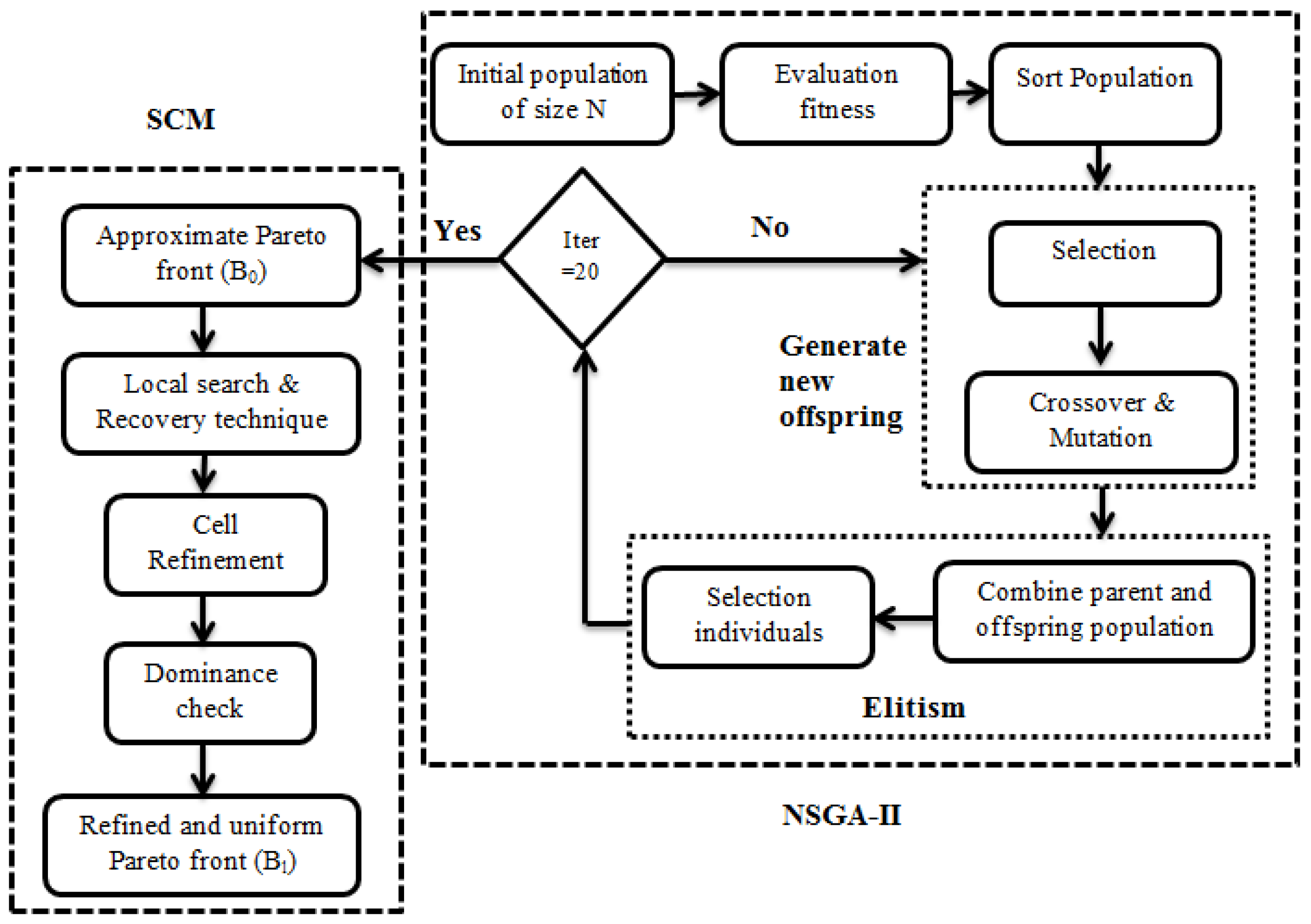 The purpose of using the NSGA-II algorithm in the hybrid method is to reduce the computational burden of the entire search space. Since we use a small population size in the NSGA-II, the entire Pareto set is not formed. The SCM method is used in the following. This method works in such a way that it evaluates neighboring cells.