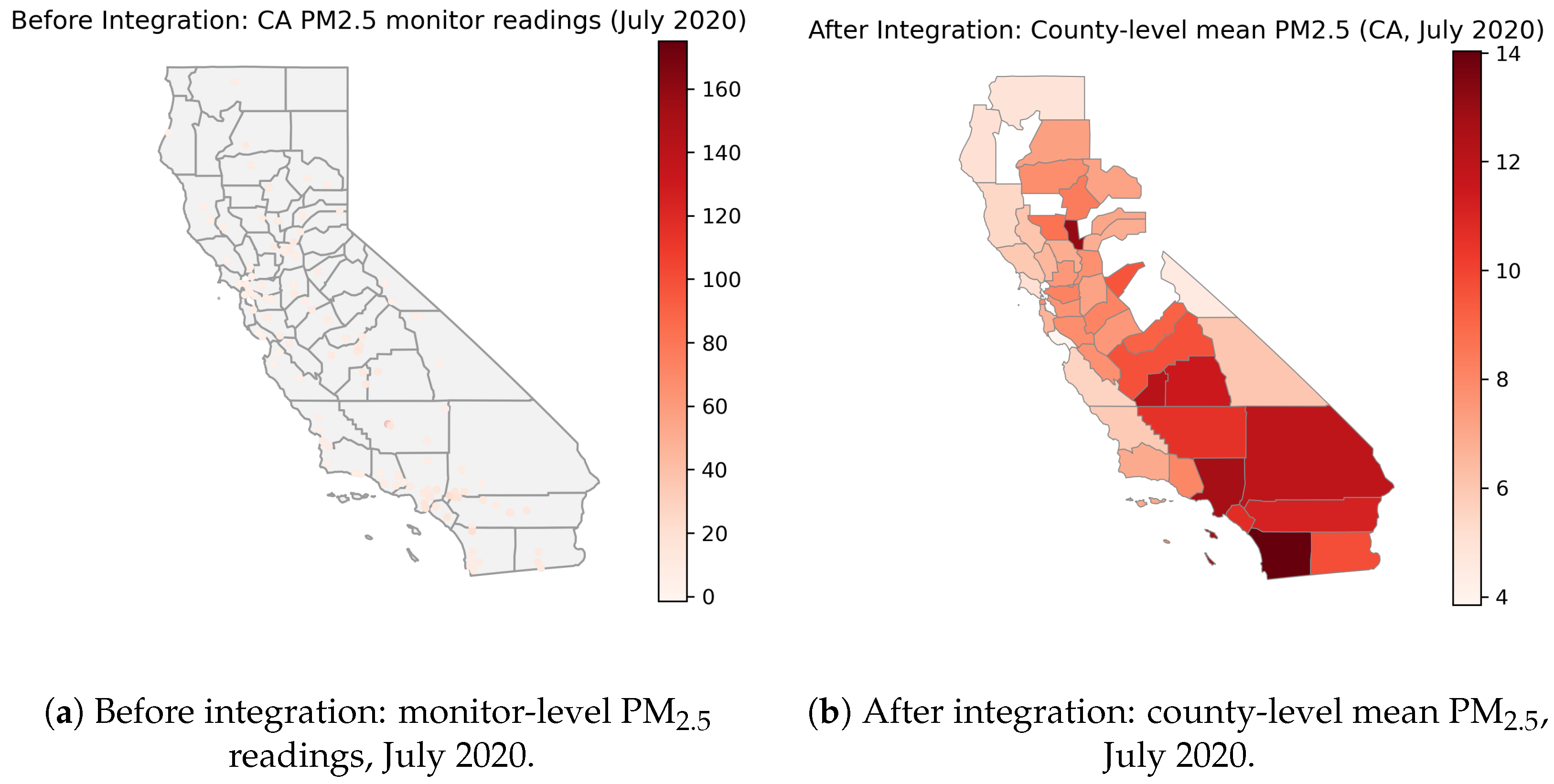 - Policy alignment through spatial aggregation. Aggregating monitor readings to counties produces indicators aligned with decision-making units, improving interpretability for health and regulatory uses.