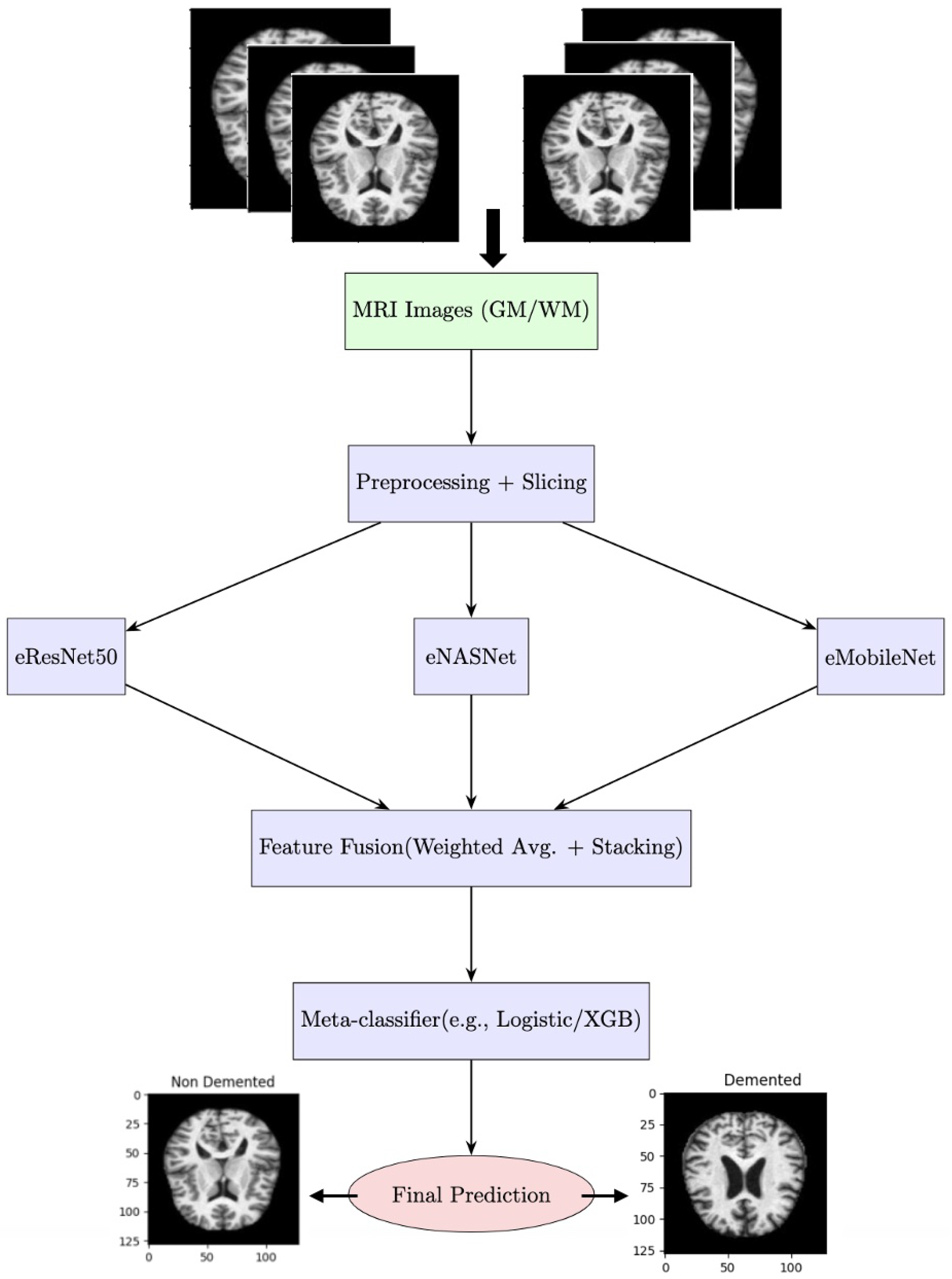 - We propose a novel ensemble diagnostic pipeline for Alzheimer’s disease (AD) classification that integrates transfer learning, weighted averaging, and stacked generalization into a unified framework.