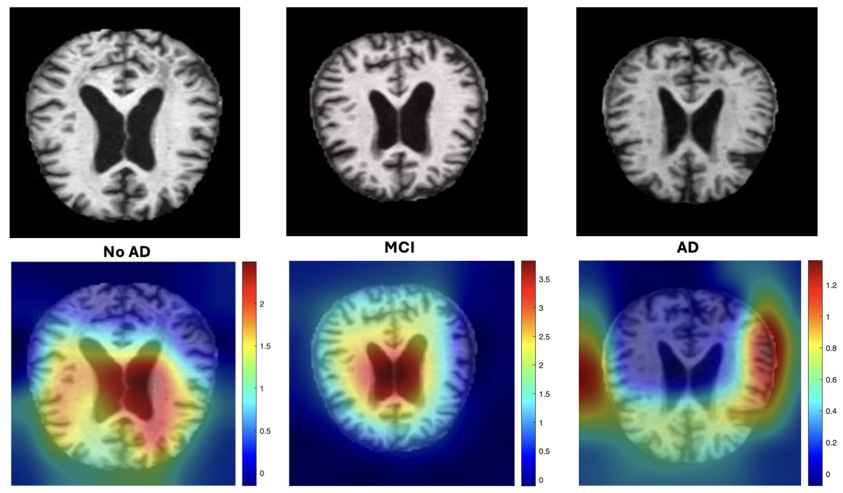 - We incorporate interpretability through Grad-CAM overlays (Figure 1), which demonstrate that the model consistently attends to clinically relevant neuroanatomical regions associated with AD progression.
