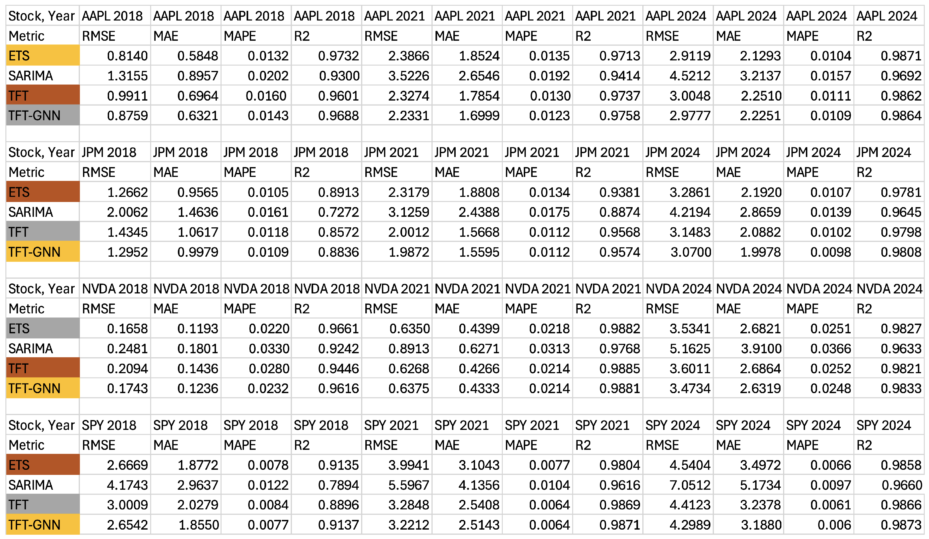 | TFT | Strong multivariate forecasting with interpretable attention. | Still treats assets independently; high computational cost. | Lacks mechanism for incorporating relational information. |