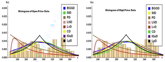 The goodness-of-fit measures across all Tables, i.e., Table 10, Table 13, Table 15, Table 20 and Table 22, indicate that the BGGD consistently provides the best fit for TSLA’s open, high, low, and close prices, as demonstrated by its lower KS statistics (e.g., 0.1059 for open prices) and higher p-values (e.g., 0.2118 for open prices), suggesting it accurately captures the stock’s price distributions. In contrast, the Pareto Distribution (PD) and Lévy Distribution (LvD) perform poorly, with high KS statistics (e.g., 0.3954 for LvD in open prices) and near-zero p-values, reflecting their inability to model TSLA’s price behavior. For trading volume, BGGD again shows the strongest fit (KS = 0.0607, p = 0.7480), while heavy-tailed distributions like LvD fail (KS = 0.2958, p = 0.0000). These results align with TSLA’s empirical data—extreme volatility and fat-tailed returns—highlighting BGGD’s robustness in modeling such dynamics compared to traditional distributions.