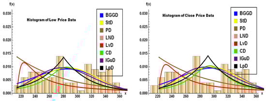 The close price in stock trading is a crucial indicator that represents the final trading value of a stock for a given day. It serves as a key reference point for investors and traders to assess the stock’s daily performance, analyze trends, and make informed decisions. Many technical analysis tools and indicators rely on closing prices to identify patterns and signals, while major stock indices are calculated based on these prices, reflecting overall market performance. Additionally, the close price is used for performance evaluation, settlement, and financial reporting, making it an essential metric in the world of stock trading. In a nutshell, raw open, low, high, and close prices are generally non-stationary, but their returns tend to be stationary, making them more suitable for statistical modeling and analysis. Based on the observations from Table 20, it is evident that the BGGD model provides the most accurate representation for predicting stock closing prices. Therefore, we conclude that BGGD is the most appropriate choice for modeling close price data.