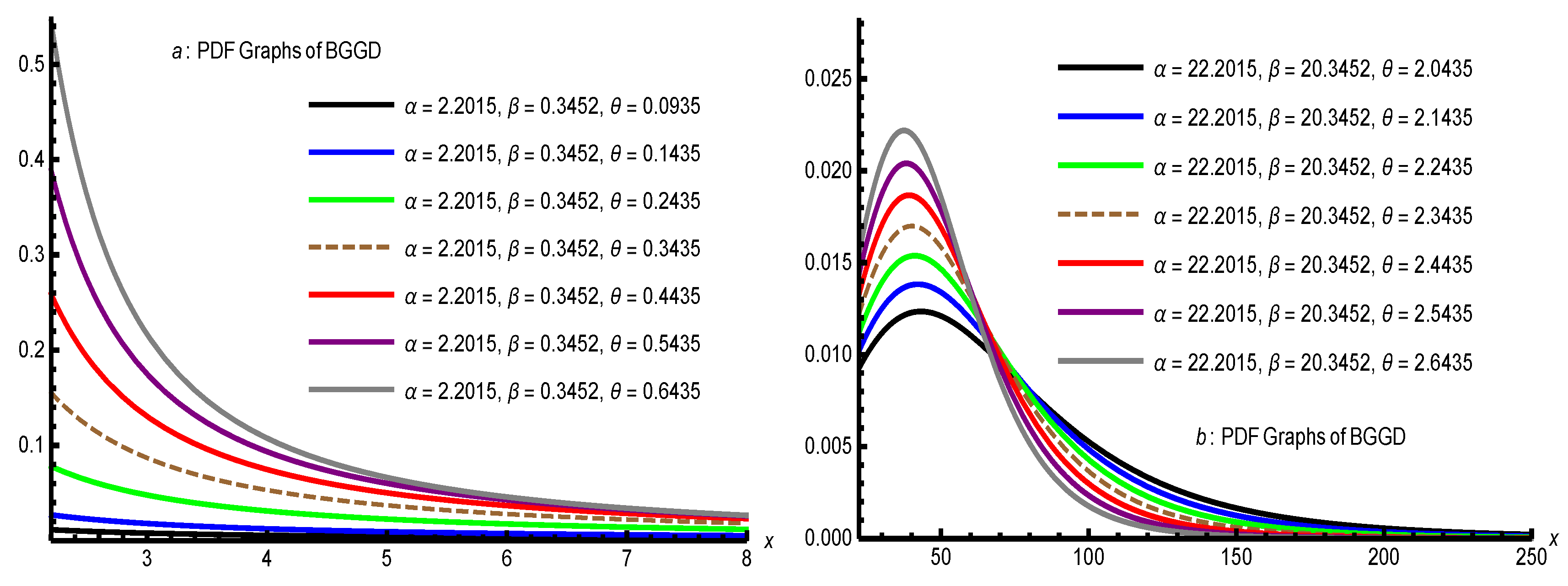- Finally, we propose a new class, the bounded Gamma–Gompertz family, by substituting into and applying the necessary domain constraints to ensure that the resulting function iswhich, after simplification, yieldswhich is constrained both theoretically and empirically. If , the CDF reduces to which resembles a Pareto-like distribution. For , it simplifies to a shifted Lomax distribution. Moreover, Figure 1 portrays that dissimilarities in parameters impact the height, spread, and shape of the curves. Smaller values of , , and result in taller, sharper curves that drop rapidly, whereas larger values generates flatter, wider curves with heavier tails and more dispersed data. The left graph illustrates PDFs over a smaller x-range (0–8), while the right graph outspreads the analysis to a larger scale (up to 250). Overall, the figure demonstrates the sensitive dependence of the BGGD PDF on its parameters, affecting both the peak and tail characteristics.