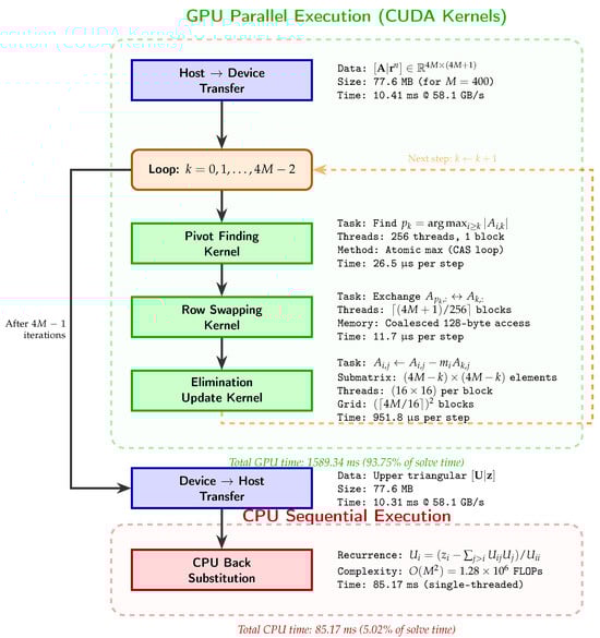 Figure 1 illustrates the computational pipeline for solving the linear system via GPU-accelerated Gaussian elimination with partial pivoting. The workflow consists of five sequential phases: (1) host-to-device transfer of the augmented matrix; (2) iterative execution of three CUDA kernels within a -step loop; (3) device-to-host retrieval of the upper-triangular result; (4) CPU-based back substitution exploiting cache locality; and (5) non-negativity enforcement. The decision to perform back substitution on the CPU rather than the GPU reflects the inherent data dependency , which prevents effective parallelization for systems with .