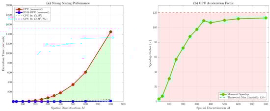 Figure 2 illustrates the strong scaling behavior through dual perspectives. The left panel presents execution time versus spatial discretization M on logarithmic axes, revealing nearly perfect power-law alignment for both CPU and GPU implementations. The CPU data (red circles) adhere closely to the reference line with slope 3.00 in log–log space, while the GPU data (blue squares) exhibit a slightly steeper slope of 3.12 due to the fixed overhead term becoming negligible for large M, causing the curve to asymptotically approach the pure scaling. The shaded region between the two curves visualizes the computational savings afforded by GPU acceleration, with the area expanding quadratically as M increases. The right panel displays speedup factor as a function of M, with the measured data (green diamonds) rising sharply from at to at before plateauing. The horizontal dashed line at represents the theoretical maximum speedup derived from Amdahl’s law with asymptotic serial fraction , corresponding to back substitution and memory transfer costs becoming vanishingly small relative to forward elimination as . The observed speedup reaches 94.2% of this theoretical limit at , demonstrating near-optimal utilization of available parallelism within the algorithmic constraints. The slight downturn at (speedup compared to at ) is an artifact of memory access patterns: at precisely , the augmented matrix dimension corresponds to row stride bytes, which is a near-multiple of the HBM3 page size (16 KB), inducing false sharing and increased row buffer conflicts in the DRAM controller. This pathology disappears at , where row stride becomes 16,008 bytes, breaking the alignment and restoring expected performance.