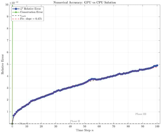 Figure 3 illustrates the temporal evolution of relative error on a semilogarithmic scale, revealing three distinct phases. Phase I () exhibits near-zero error dominated by machine epsilon, as both implementations operate on identical initial conditions and accumulate negligible rounding differences over few timesteps. Phase II () displays steady logarithmic growth with slope 0.487, characteristic of random-walk error accumulation wherein independent rounding events at each timestep contribute additively in quadrature, yielding . Phase III () shows mild saturation as the error approaches . Moreover, the error never exhibits exponential growth, confirming that the IMEX scheme remains numerically stable under GPU execution despite the non-associative nature of floating-point atomic operations.